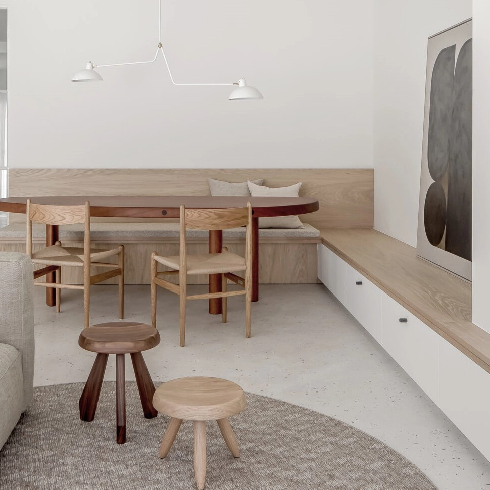 Mientras que en toda la casa priman las líneas rectas –de una sobriedad absoluta–, en la elección del mobiliario se permitió alguna concesión a las curvas, como la citada mesa de comedor, un diseño de la francesa Charlotte Perriand comercializado por Cassina. Este clásico atemporal comparte espacio con una versión contemporánea de la rústica silla de anea y unos sólidos taburetes para los más pequeños. Son detalles que aportan auténtico sabor de hogar y hacen la vida más cómoda y fácil a toda la familia.