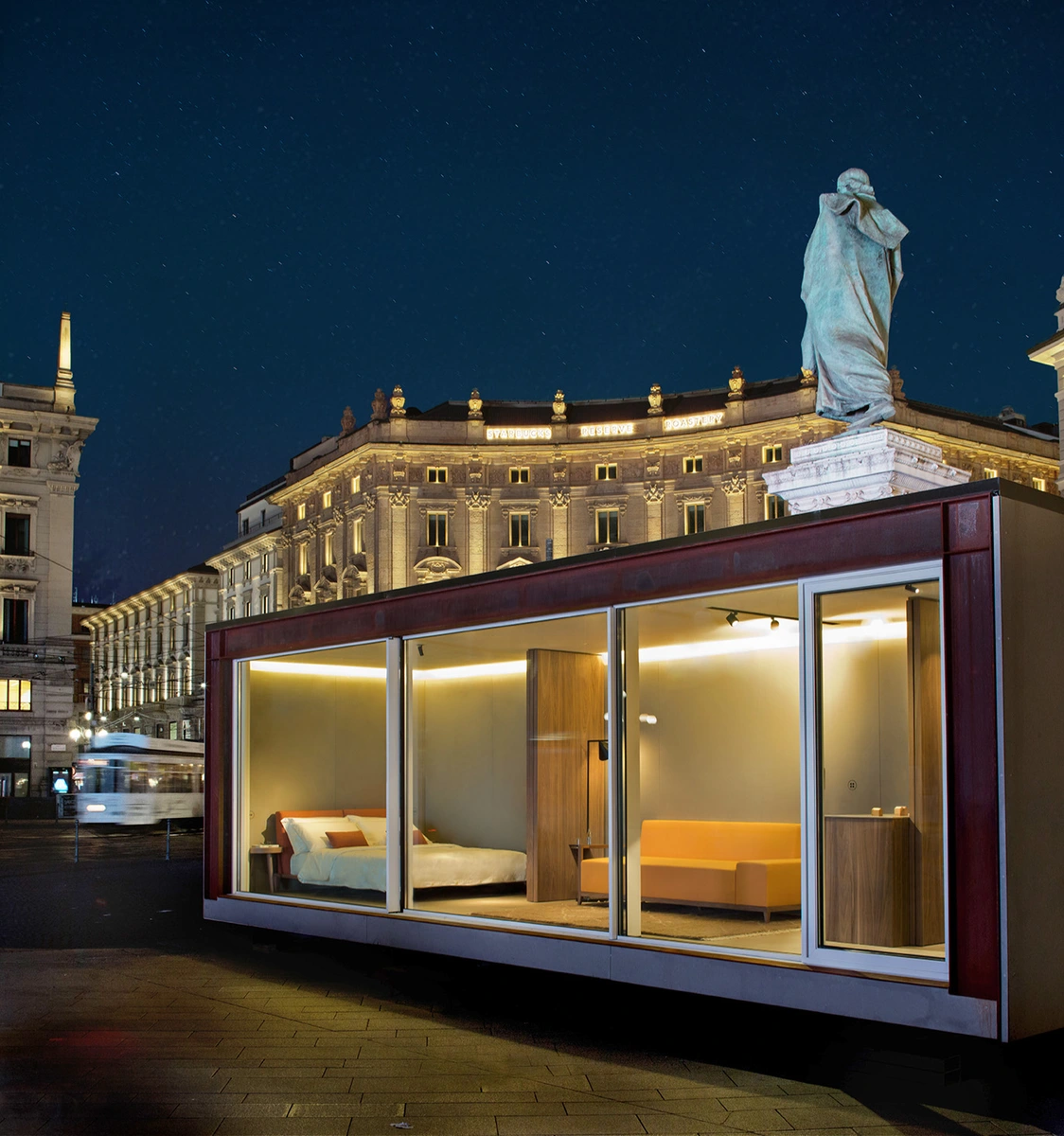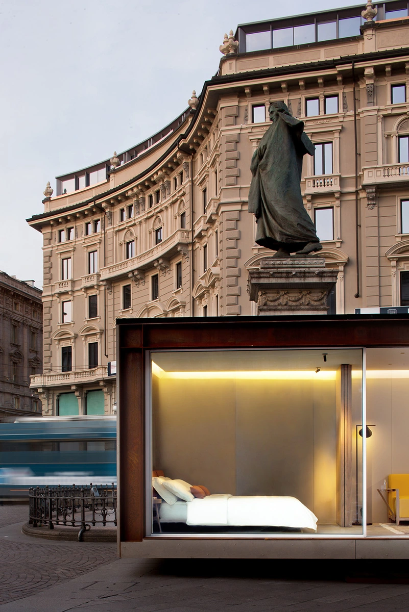 Diseñada por el equipo veronés ARC Studio Perlini, consta de un único módulo de 9 x 3 metros, unas dimensiones que facilitan el transporte y su montaje posterior. La estructura de acero corten y su gran fachada panorámica son las señas de identidad de la vivienda. Cuatro acristalamientos de suelo a techo con perfiles de aluminio que sacrifican la privacidad para sumergir a los propietarios en el paisaje elegido como horizonte.
