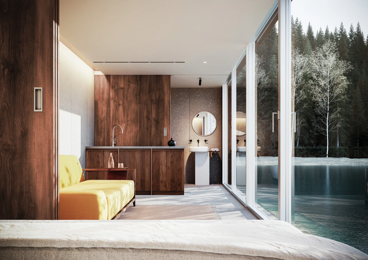 En cuanto al interior, el espacio es abierto y dispone de tres áreas diferenciadas (dormitorio, sala de estar y baño) que se pueden separar mediante paneles deslizantes de madera.