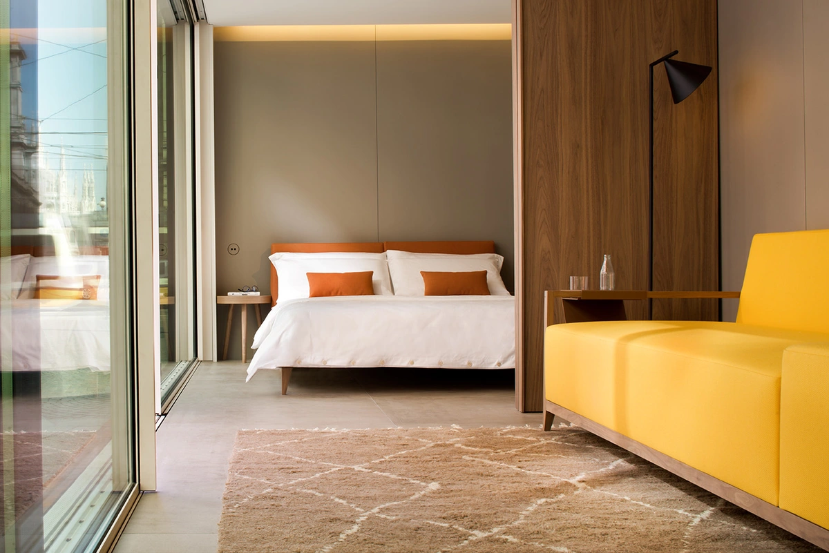 Todo el mobiliario se diseñó a medida para el proyecto. Predominan los materiales naturales –nogal americano, seda, algodón–, que conviven con multitud de accesorios en plexiglás reciclado y acero corten: revistero, bandeja, lámpara led de lectura, soportes…