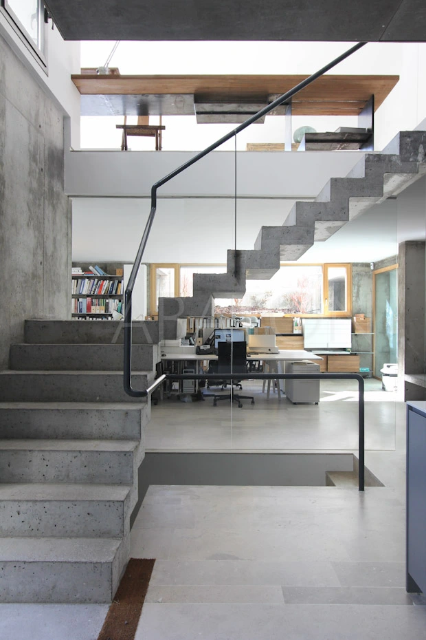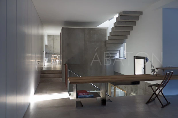 Además, una escalera peldañeada de hormigón sirve de eje vertebrador de las diferentes zonas del edificio.