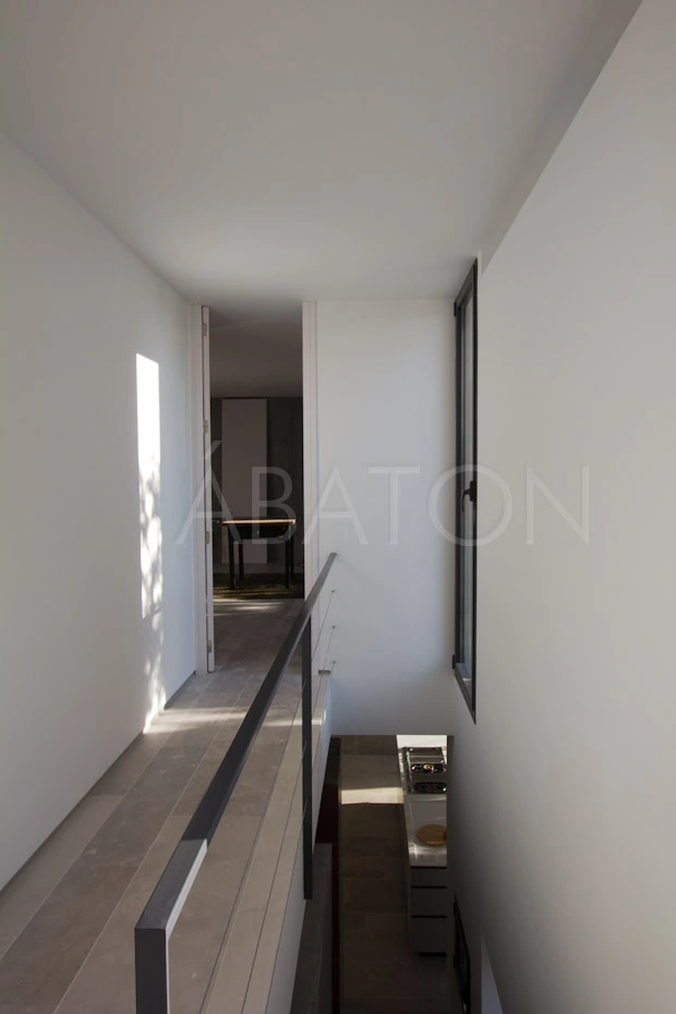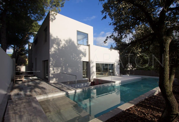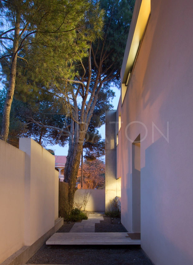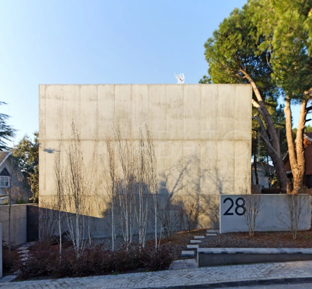 Ubicada en una urbanización residencial de las afueras de Madrid, con encinas importantes y edificaciones colindantes consolidadas. El objetivo principal fue que la propia edificación fuera un hito dentro la urbanización y mostrar la arquitectura de ABATON de forma esquemática y limpia. La fachada de hormigón se retranqueó y se cedió un espacio arbolado a la vía púbica para proponer un entorno más amable.