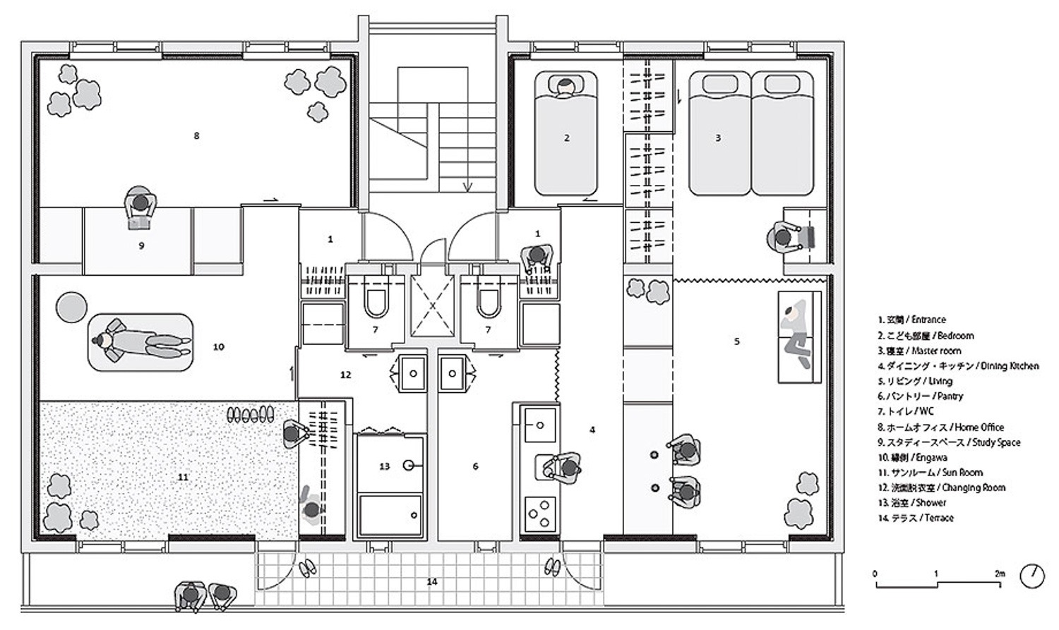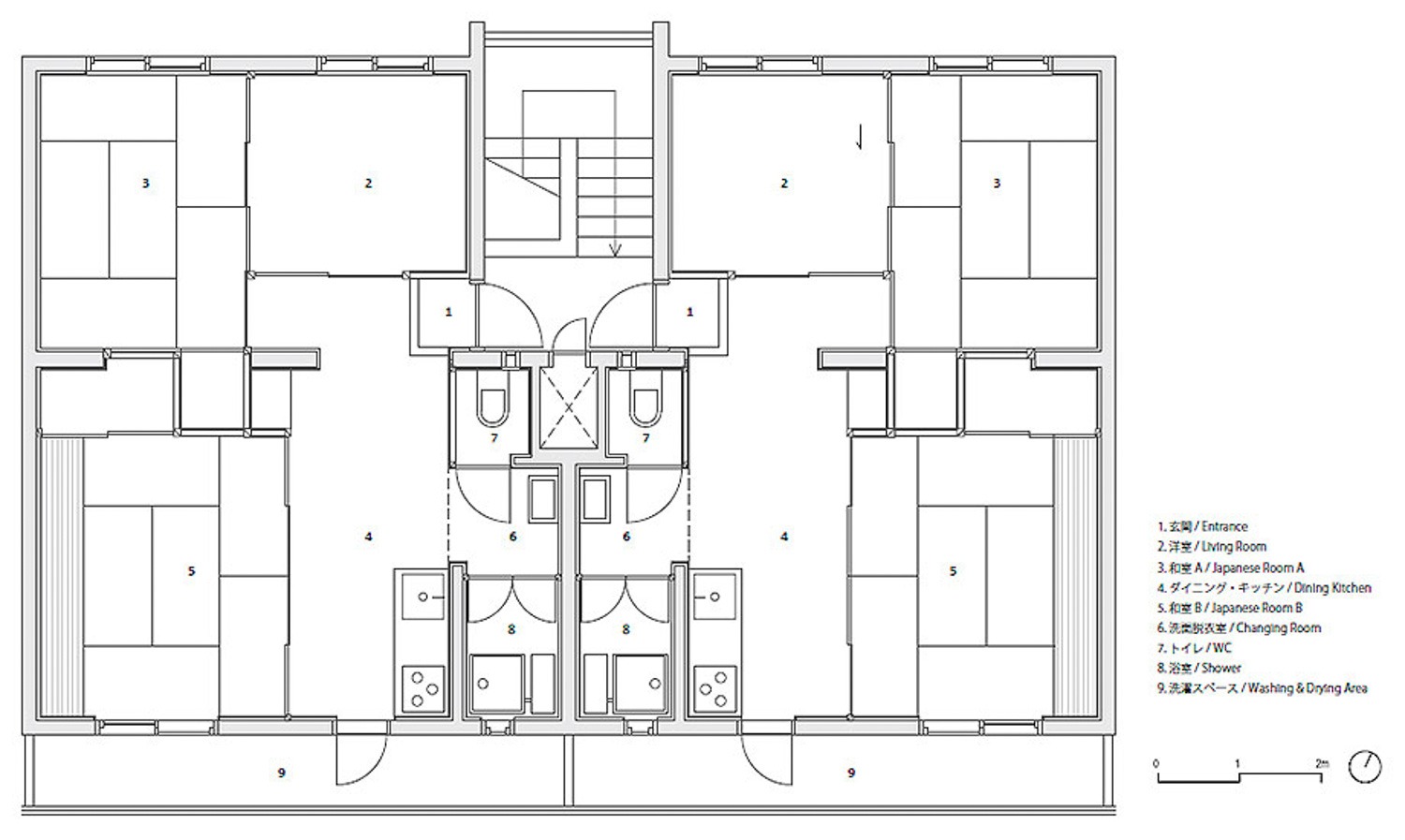 Este proyecto ganó en un concurso público promovido por la Osaka Prefectural Housing Corporation, con la premisa de transformar cuatro viviendas en dos unidades, combinando espacio privado y colectivo.