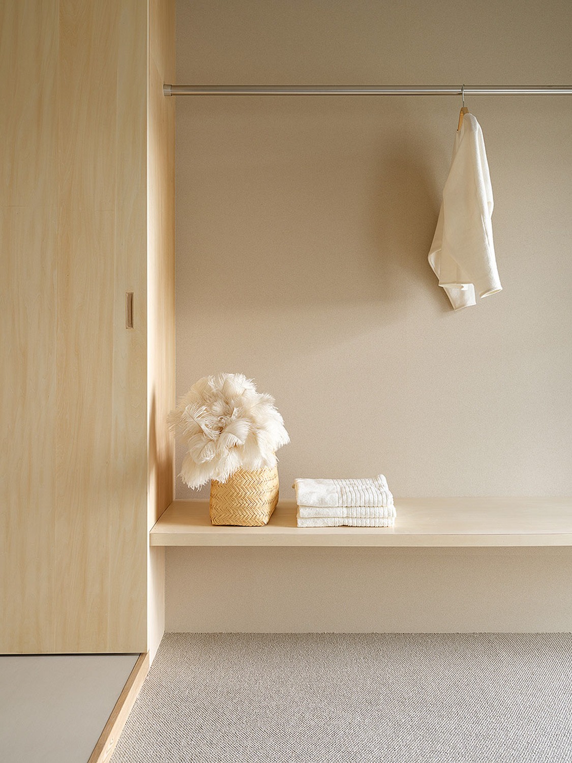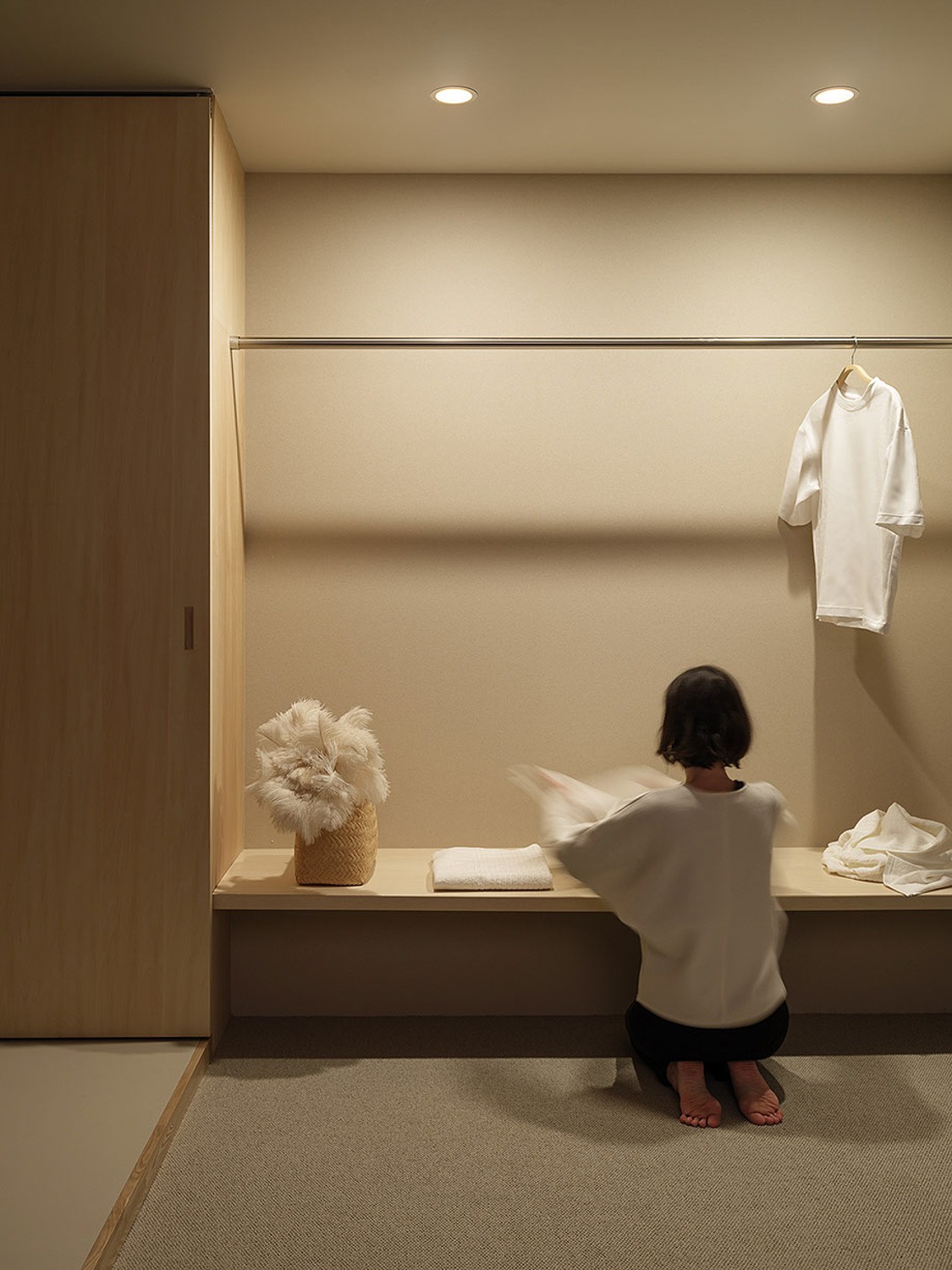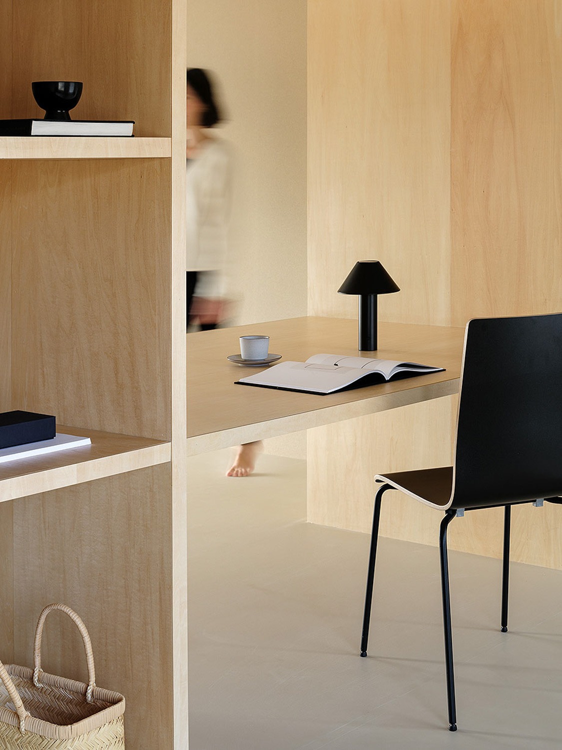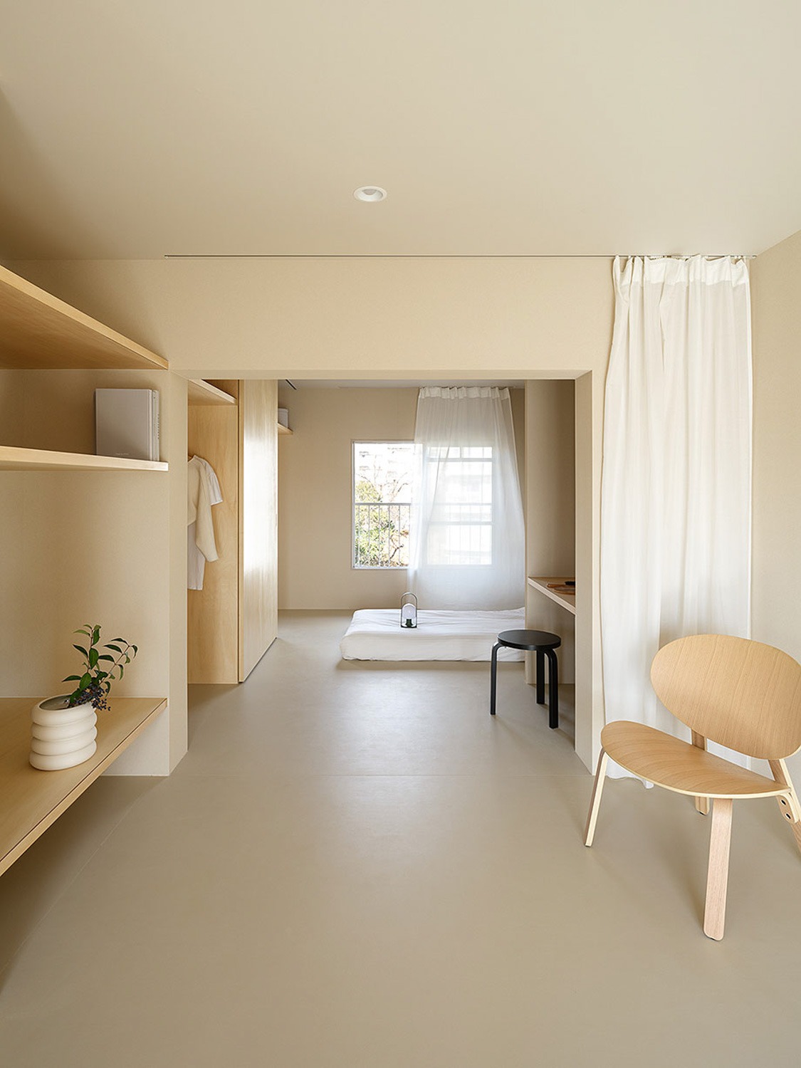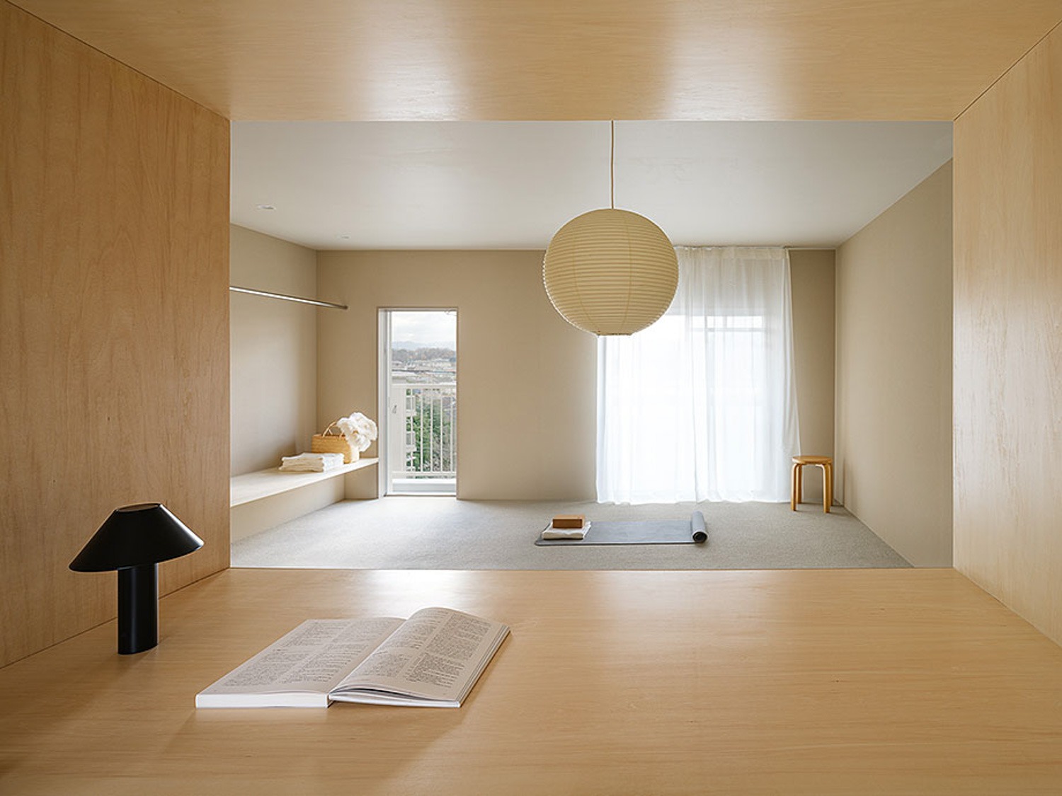 Los interiores se equipan con un mobiliario de madera minimalista que proporciona solo lo esencial. Esa restricción no es un límite: prioriza la calidad de experimentar el espacio antes que saturarlo. Las divisiones entre ambientes se realizan con piezas ligeras y elementos móviles, promoviendo la flexibilidad.