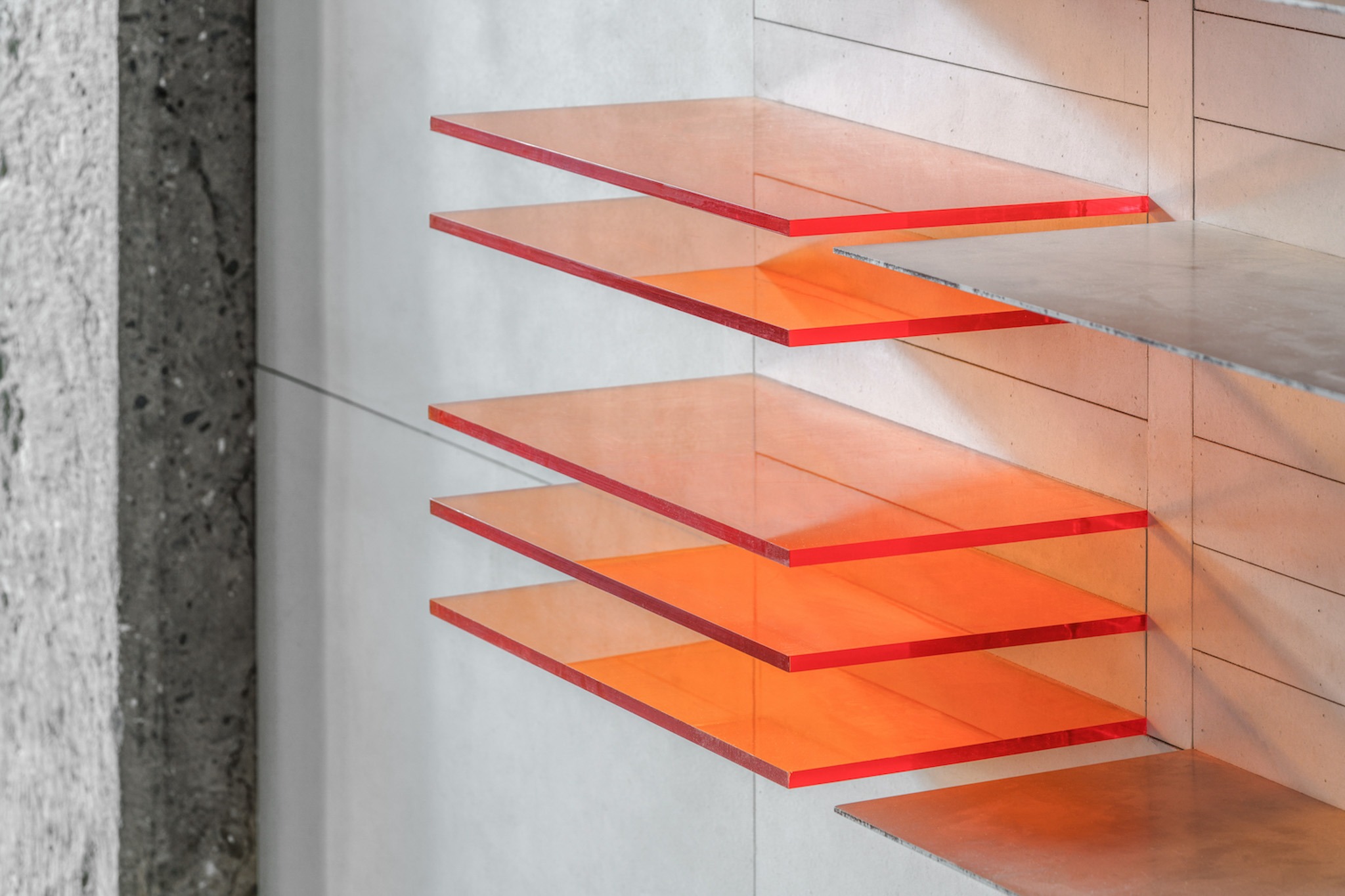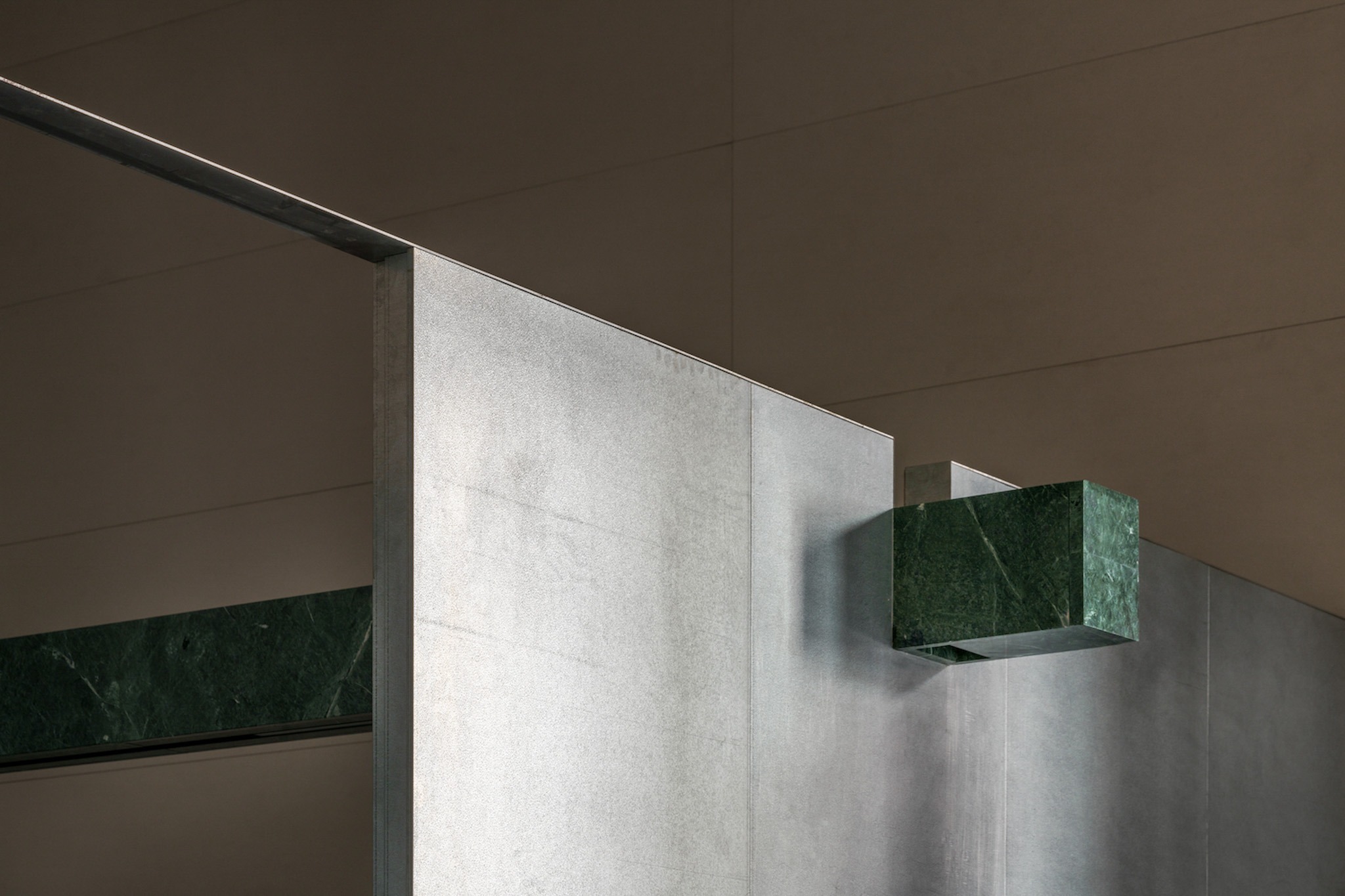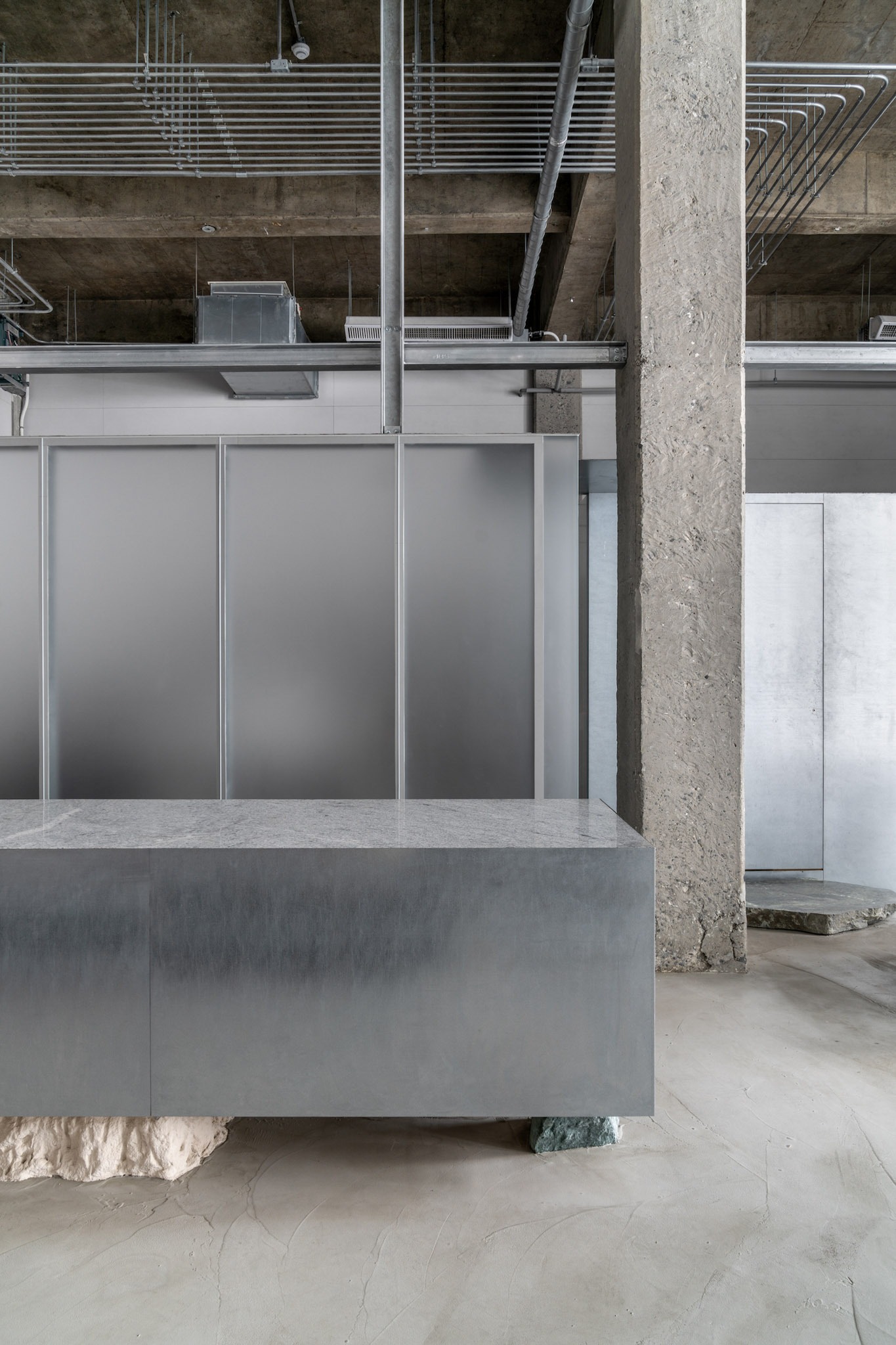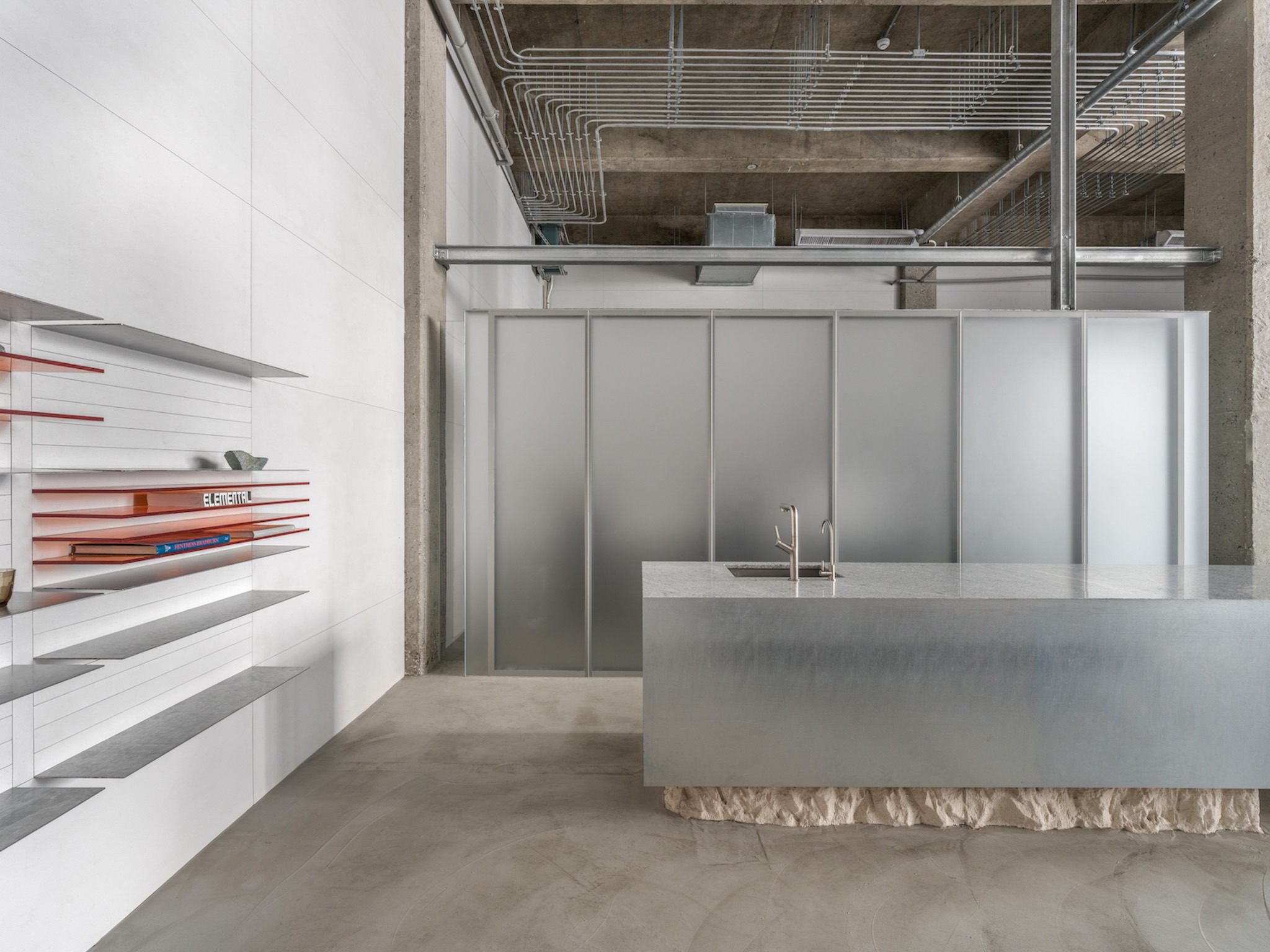 El proyecto apuesta por una estética cruda y sobria. Paneles de silicato cálcico en las paredes, superficies en bruto, estructuras de acero visibles. Todo está pensado para la durabilidad y la posibilidad de reutilización. Las plataformas de distintas alturas permiten reorganizar el espacio fácilmente según las necesidades expositivas o funcionales. Este enfoque no solo responde a criterios prácticos, sino que incorpora la idea de cambio y adaptabilidad al corazón del diseño.