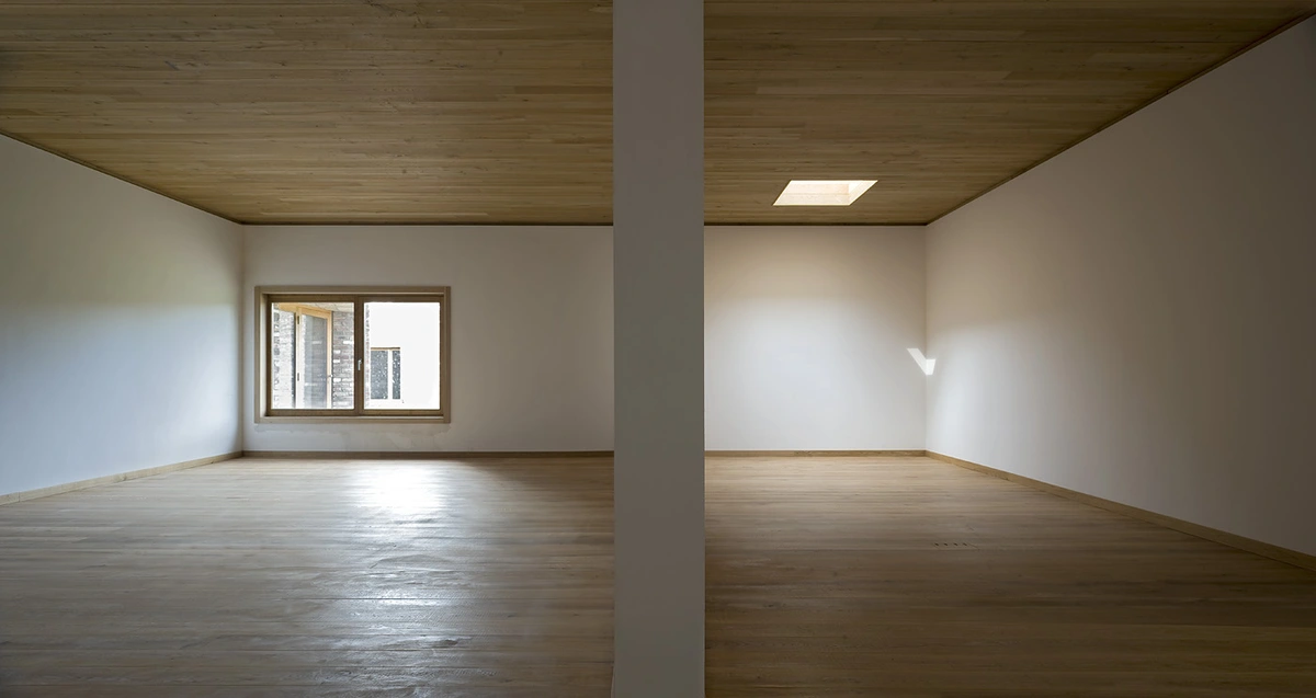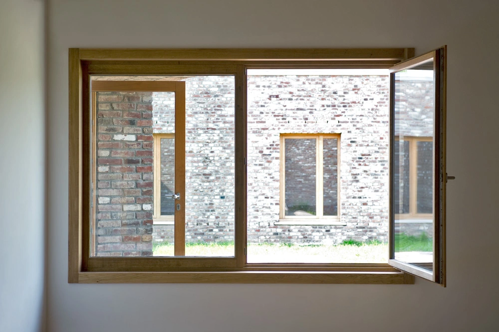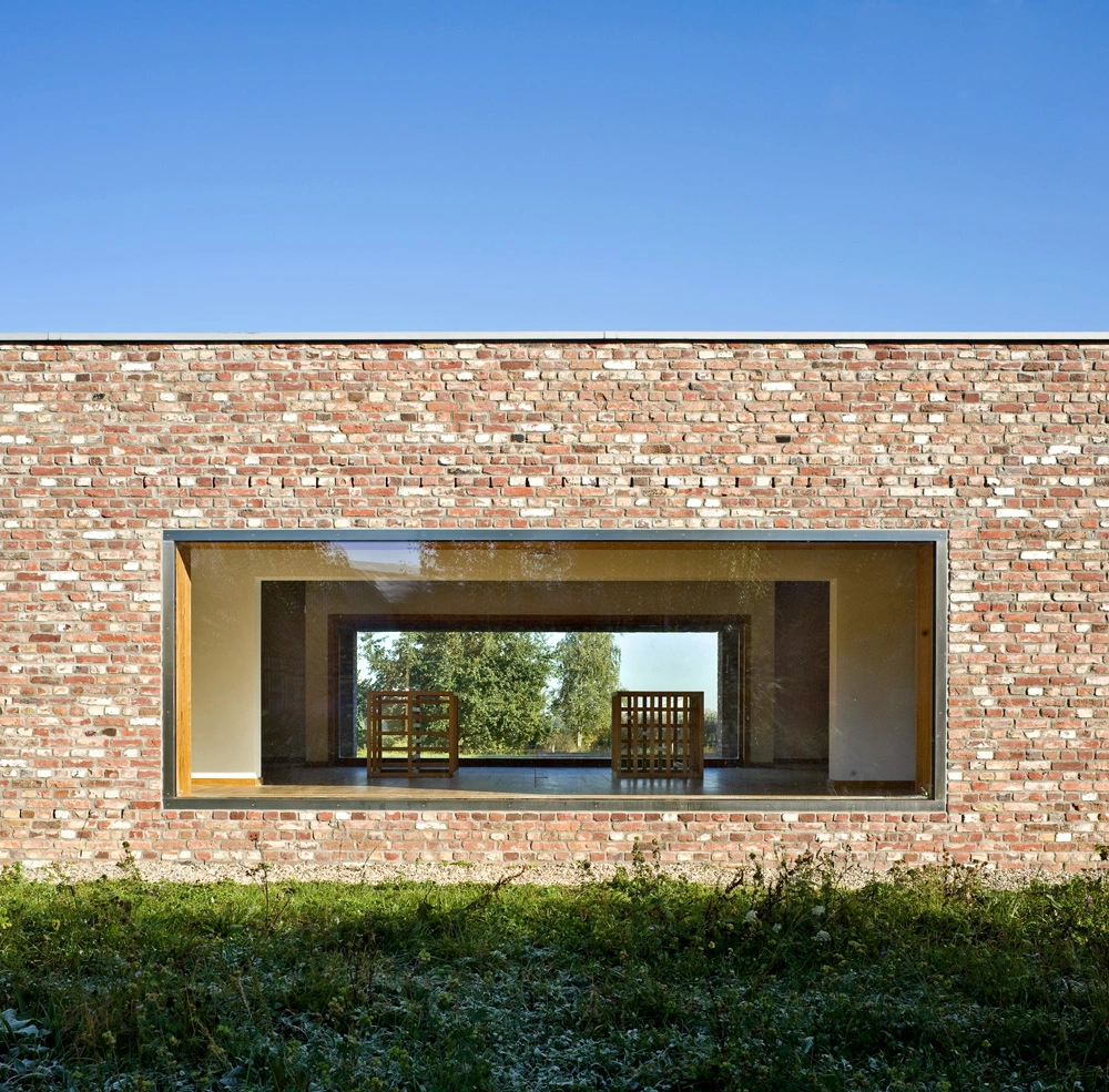 Lo primero que llama la atención es el material principal, un ladrillo jaspeado que recuerda a las granjas inglesas y que suaviza la linealidad del trazado. La elección no fue casual, pues otros de los pabellones del complejo –diseñados por Erwin Heerich– ya lo incorporaban. Sin embargo, a diferencia de estos, con un carácter más «totémico» en cuanto a su geometría, los volúmenes de Siza incorporan el paisaje en su planteamiento.