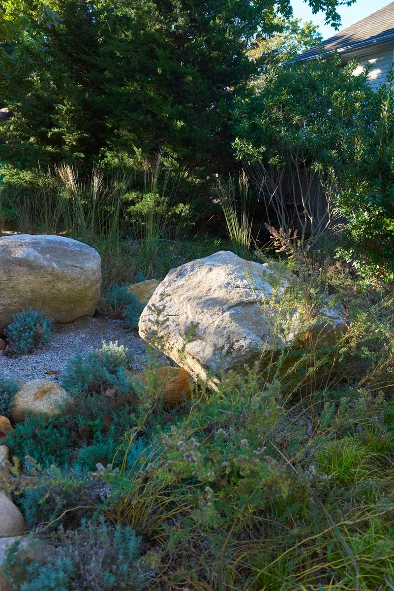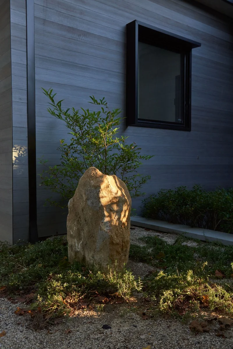 Martin Architects se inspira en la belleza del entorno nativo del East End, así como en paisajes europeos más áridos. Basándose en estas referencias, se eligió polvo de piedra natural para la entrada del camino y las áreas de estacionamiento, consiguiendo una calidad tonal apagada que complementa los plateados y verdes del paisaje.
