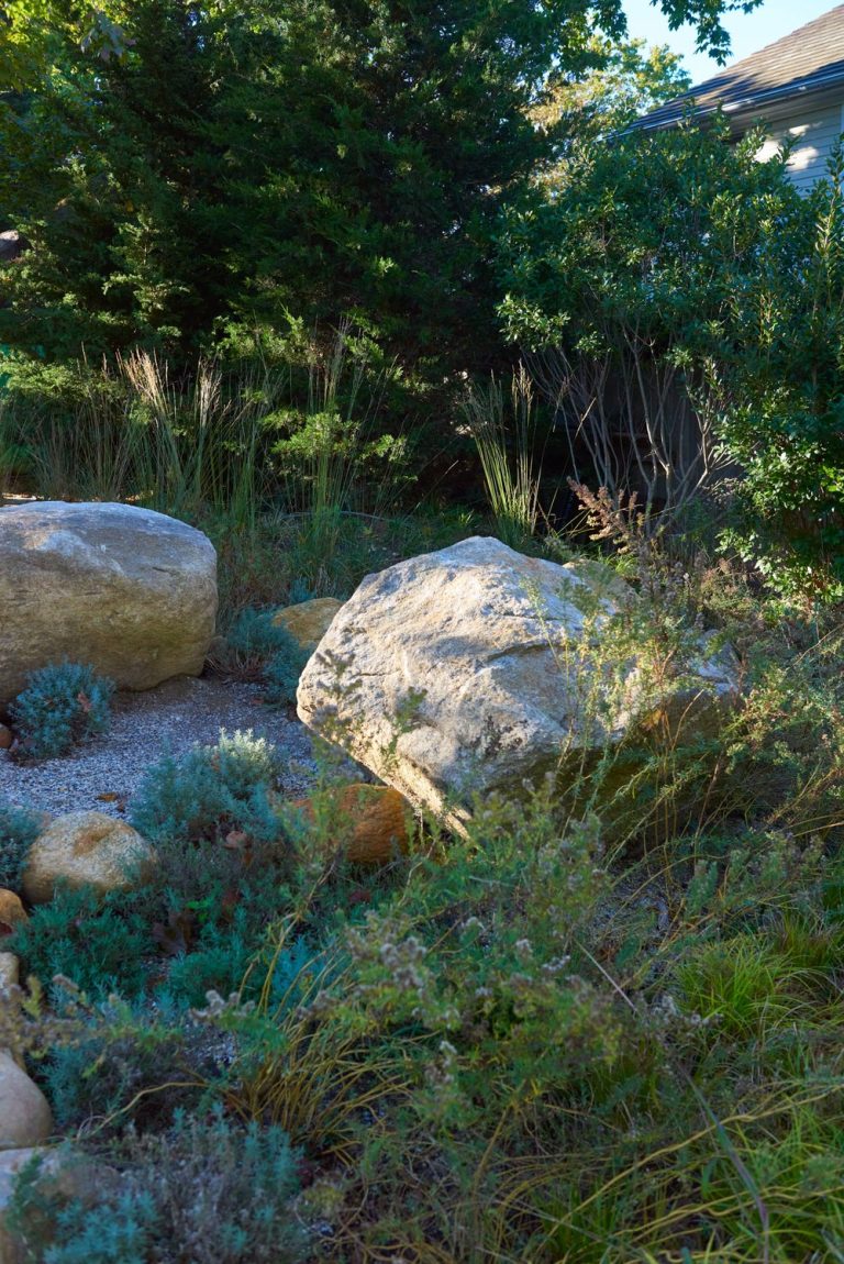 A medida que se avanza en la propiedad, el material vegetal deja mayor espacio al polvo de piedra, consiguiendo más espacio negativo hasta llegar finalmente a un patio informal con arbustos de hoja perenne.