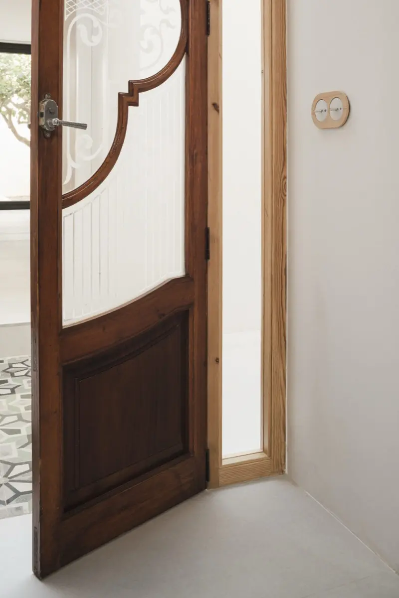 Una entrada revela el volumen original de la vivienda y su cubierta a dos aguas, una sala de estudio se transforma en habitación de invitados, una pequeña biblioteca, un espacio de estar, un comedor… El flujo espacial es continuo, solo interrumpido por una puerta rescatada que filtra y protege el corazón de la vivienda: el corral.