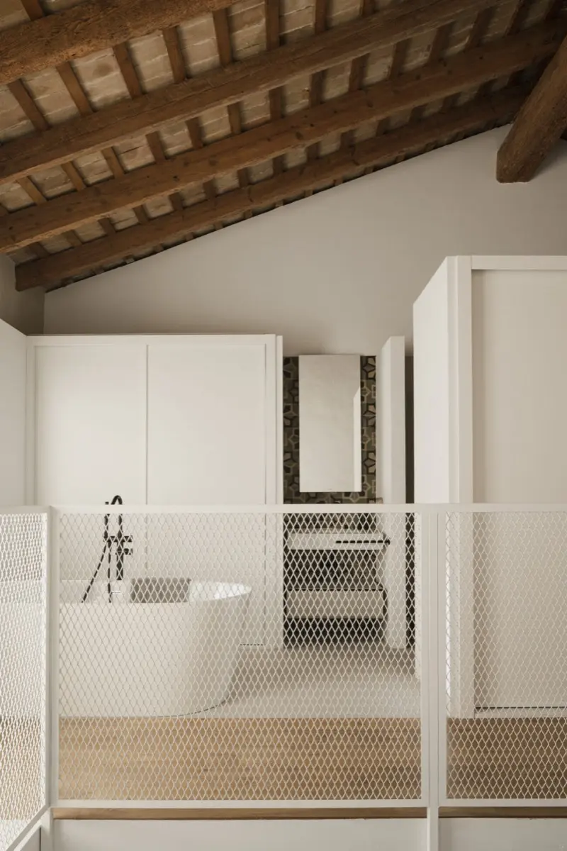 Materiales contemporáneos y limpios contrastan con las capas más antiguas de la construcción original, utilizando tabiques en seco de entramado autoportante y pavimentos uniformes de gran formato que aportan fluidez al espacio.