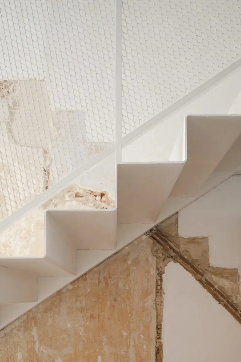 La intervención se centra en resaltar las cicatrices de las transformaciones anteriores, dejando a la vista las huellas de estructuras pasadas, como el antiguo forjado o la bóveda de tabica de la escalera, que ahora conviven con una escalera metálica de chapa plegada.