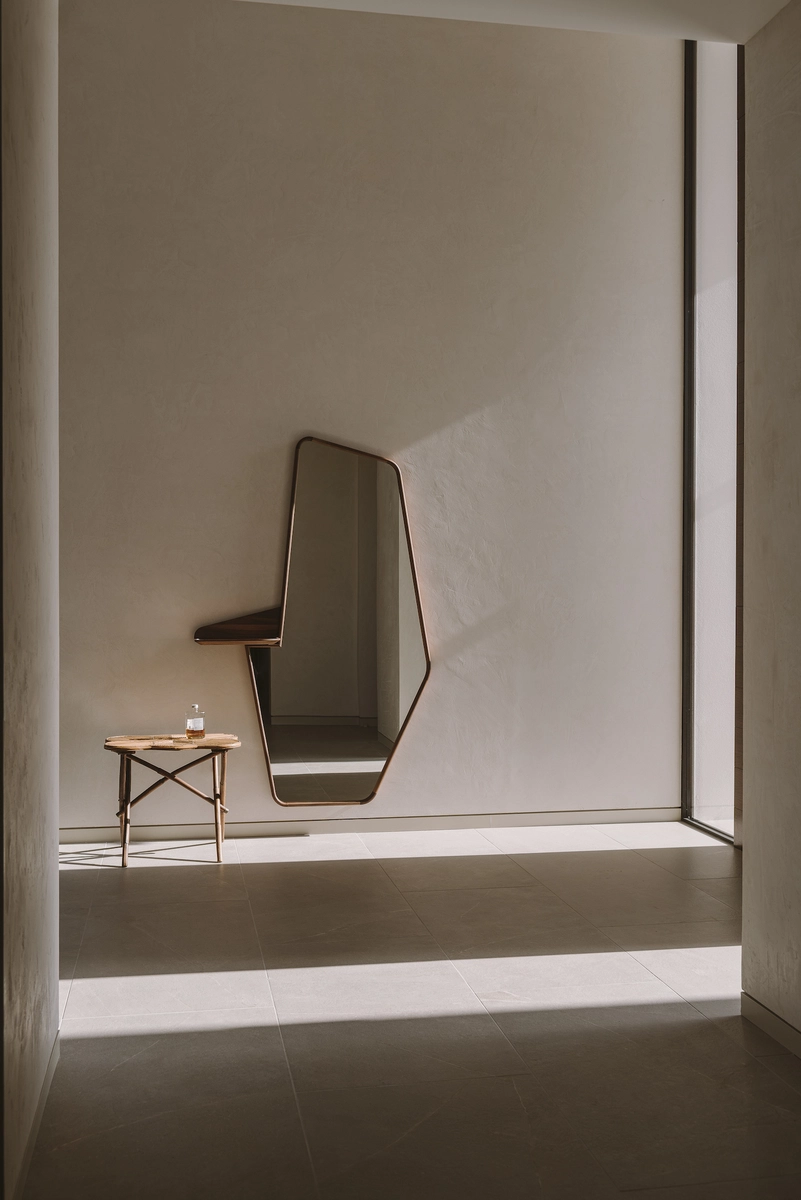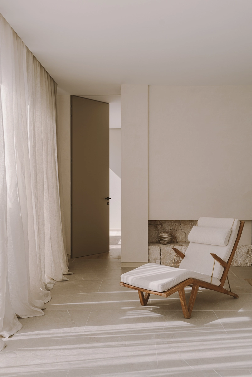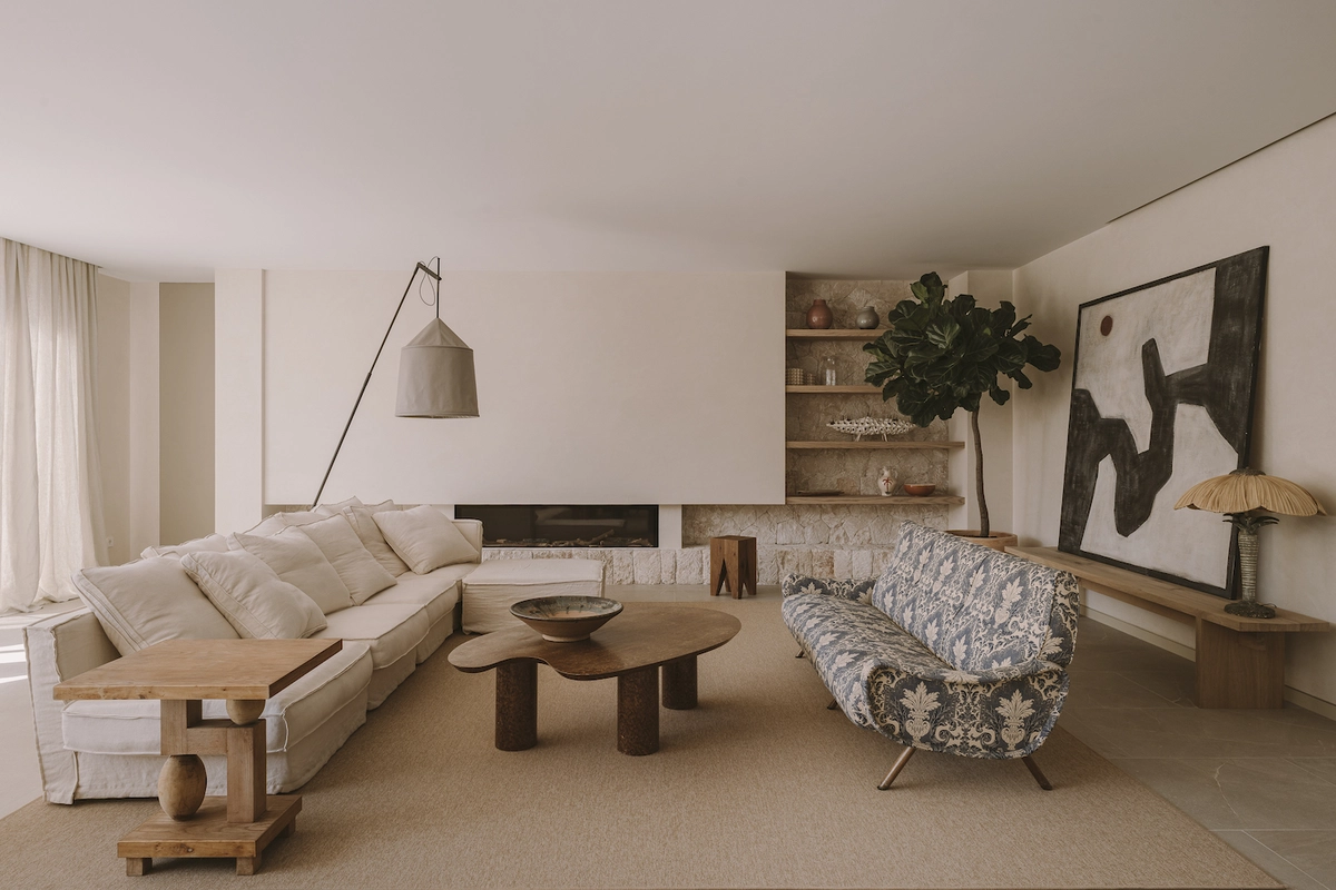 El tándem creativo formado por Zuza y Piotr Paradowski propuso finalmente un viaje en el tiempo con piezas de distintas épocas y una paleta de colores a base de blancos apagados, beige y tonos cálidos de gris. En cuanto a materiales, privilegiaron claramente la madera, el lino y la piedra caliza mallorquina, presente en la pared del salón que contiene la chimenea.