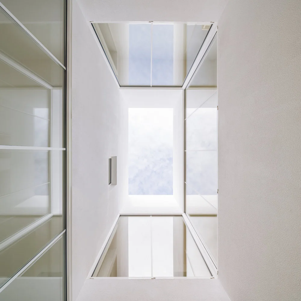 Como remate, la última planta se convierte en una terraza multifuncional. Unos techos poliédricos de hormigón, acabados en blanco, crean zonas de sombra para disfrutar a cualquier hora de las diferentes panorámicas. Su distribución diáfana también le permite transformarse en un refrescante punto de reunión familiar al acabar el día.