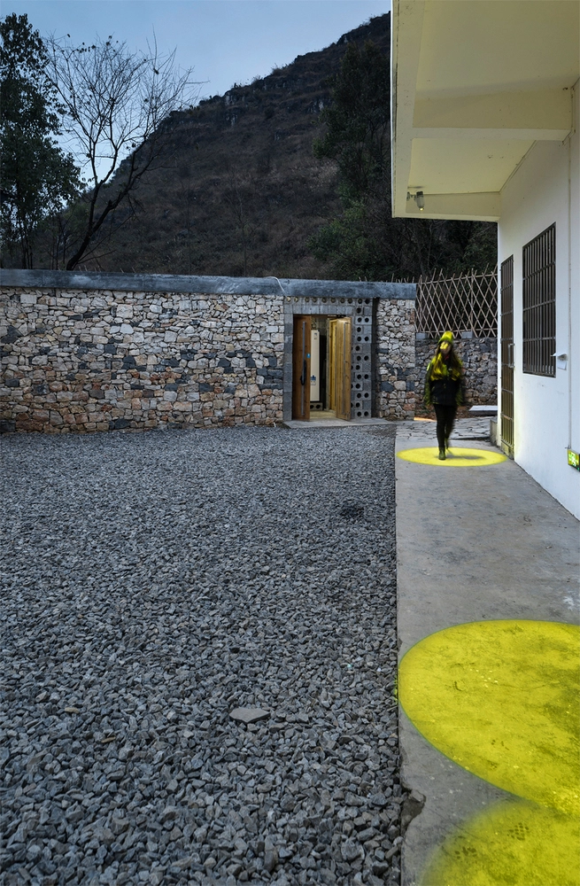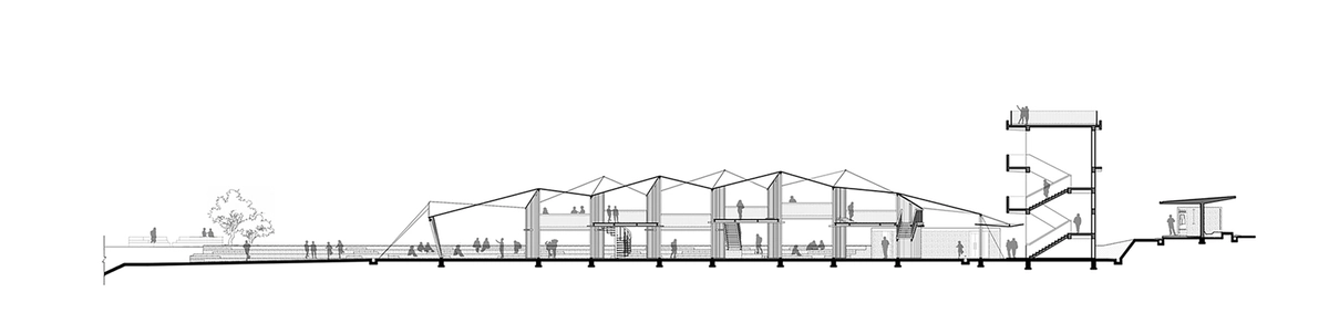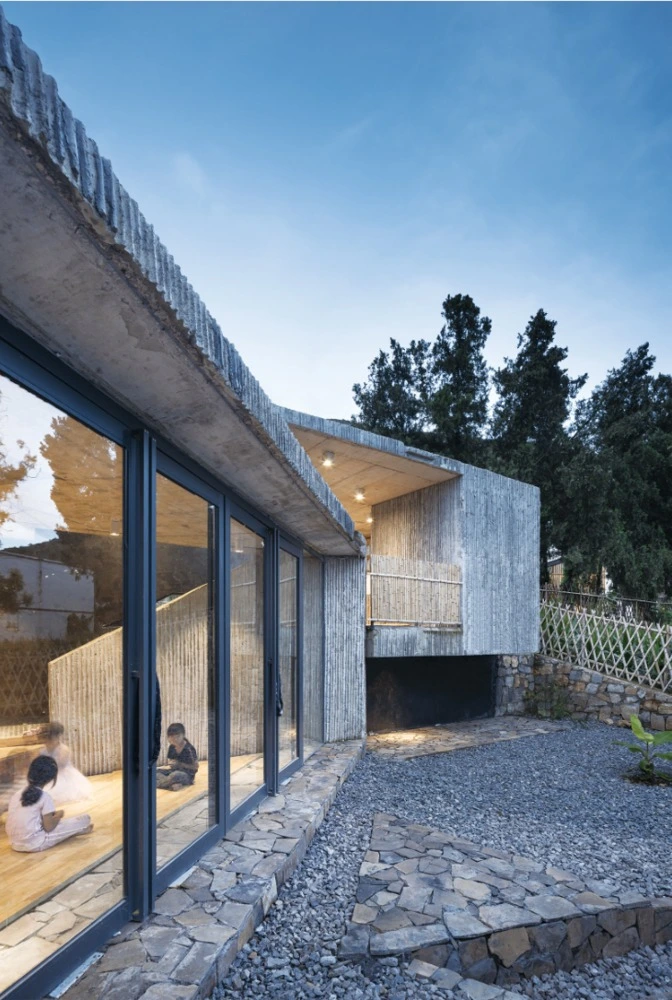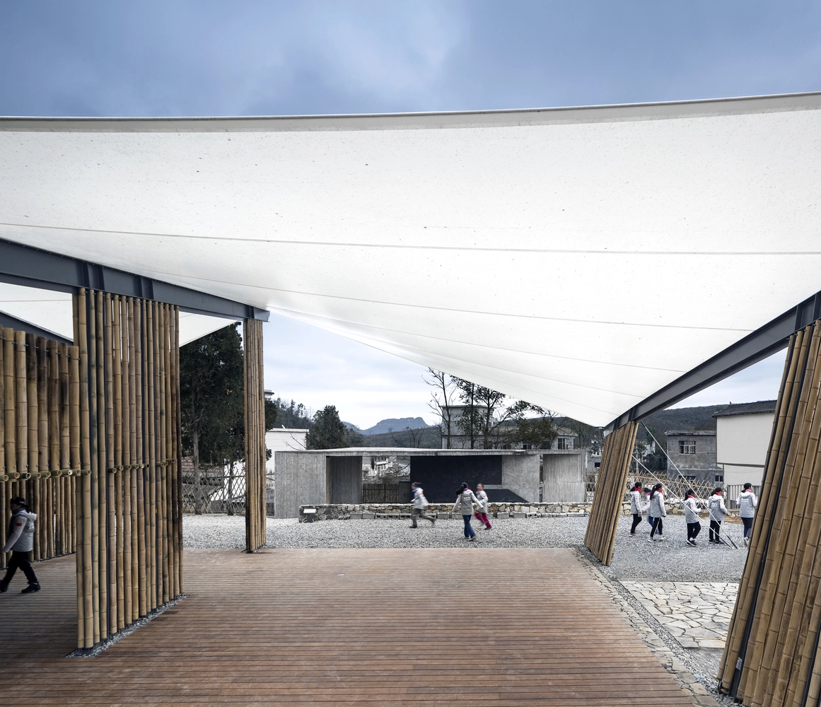 Se partió de un antiguo colegio de tres plantas, transformado ahora en un área multiusos, con dormitorios, comedor, almacenes y enfermería. Este núcleo original se extendió hacia el sur mediante un espacio alargado con múltiples salas abiertas al exterior. Una arquitectura de vigas metálicas ligeras y paredes de bambú coronada por un techo blanco ondulado.