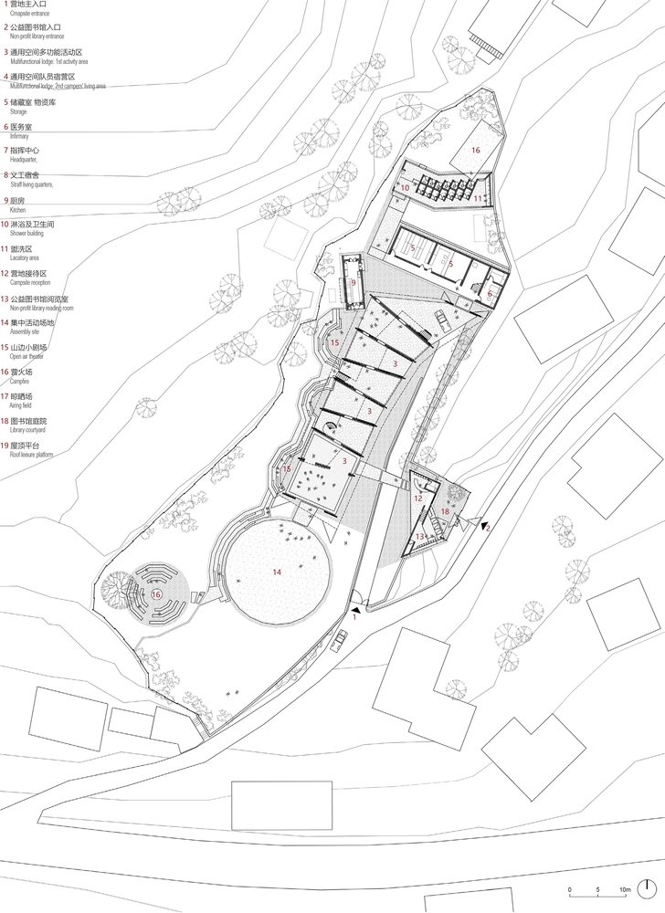 Este extenso espacio multifuncional conecta hacia el este con el área de recepción y la sala de lectura triangular del campamento, abierta también a los niños del pueblo como biblioteca para sus tareas escolares. Siguiendo la vertiente de la ladera, la zona al aire libre está rematada por dos amplios espacios circulares con gradas, ideales para actividades en grupo.