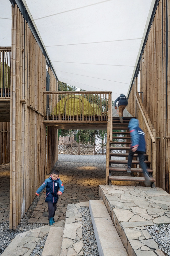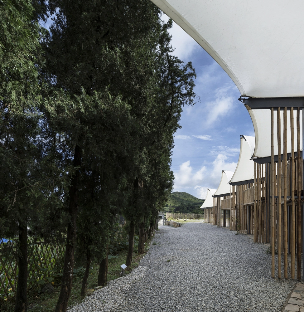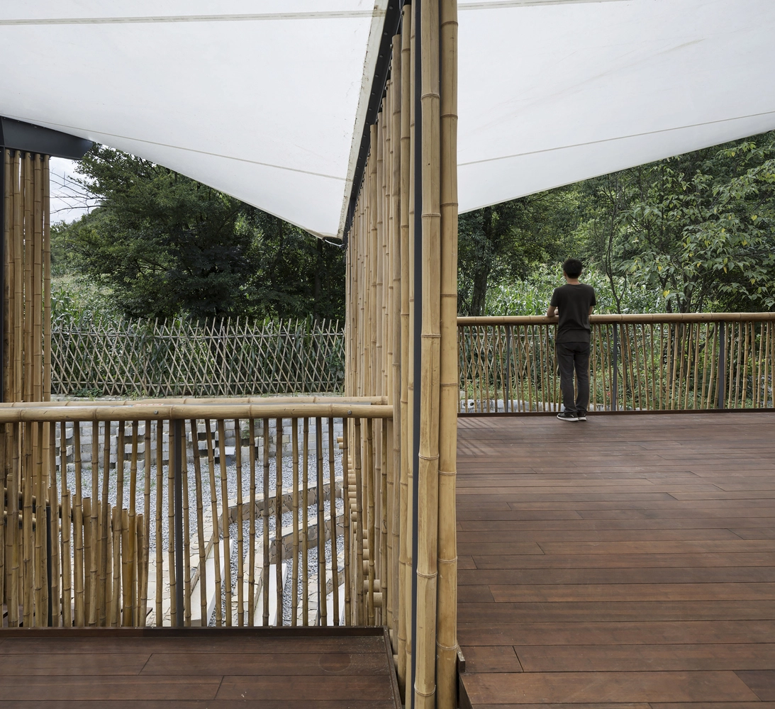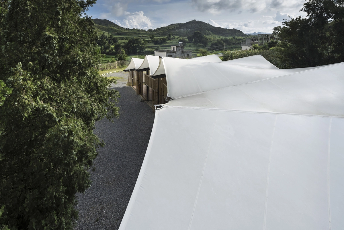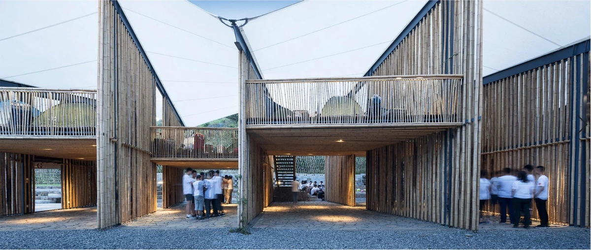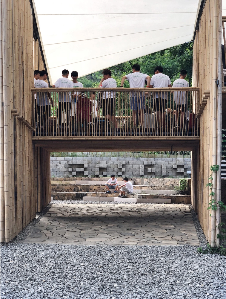 Aunque goza de temperaturas moderadas, la lluvia es bastante frecuente en esta región de Guizhou los meses de verano, por lo que era primordial asegurar una buena impermeabilización y ventilación de las instalaciones. Para ello, la arquitectura de bambú crea tabiques permeables al aire y aberturas laterales que permiten disfrutar desde el interior de las vistas a la zona arbolada y las montañas. Por su parte, el tejido impermeabilizado de los distintos módulos del tejado hace posible seguir con las actividades programadas los días lluviosos, drenándose el agua vertida en los suelos de grava aledaños.