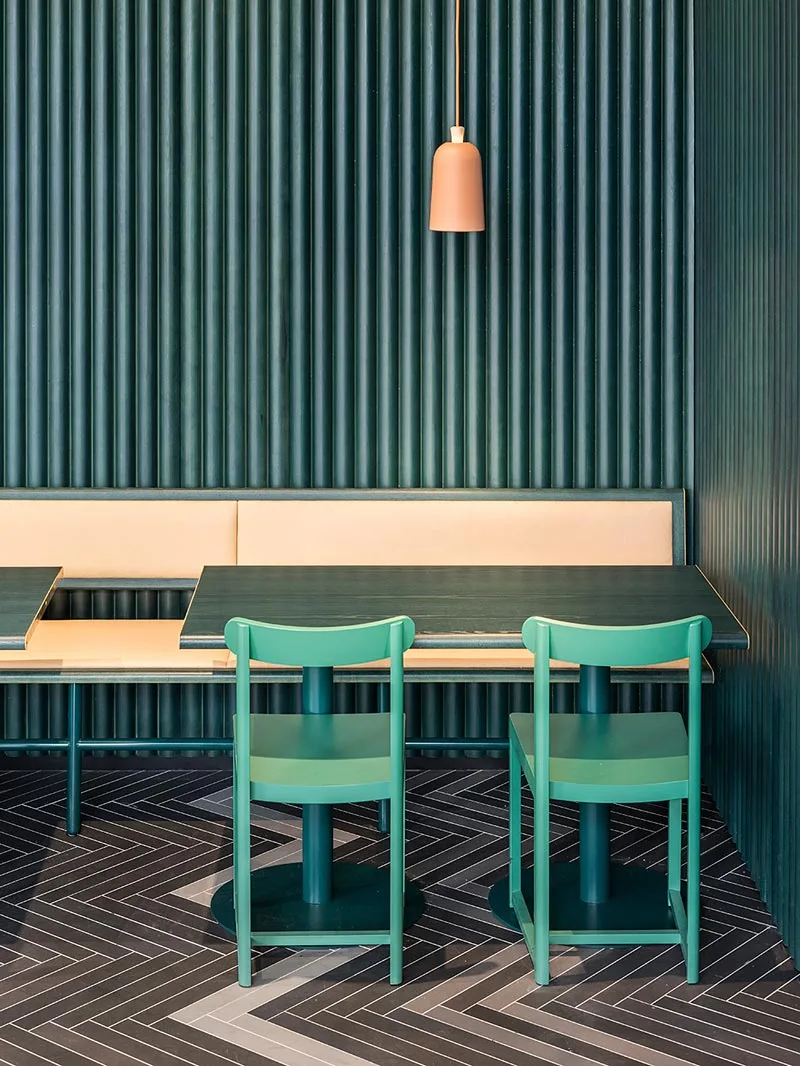 Una vez escogidos estos colores pastel, se decidió crear una zona abierta con banquetas para la parte de atrás, añadiendo mobiliario ligero en la línea minimalista de la escuela escandinava. Para el suelo, se eligió un diseño dinámico de baldosas en forma de espiga realizado para la ocasión, con un degradado que representa los matices de cada roca en las montañas y que integra también elementos exóticos, como el mármol verde de Guatemala para la zona del bar.