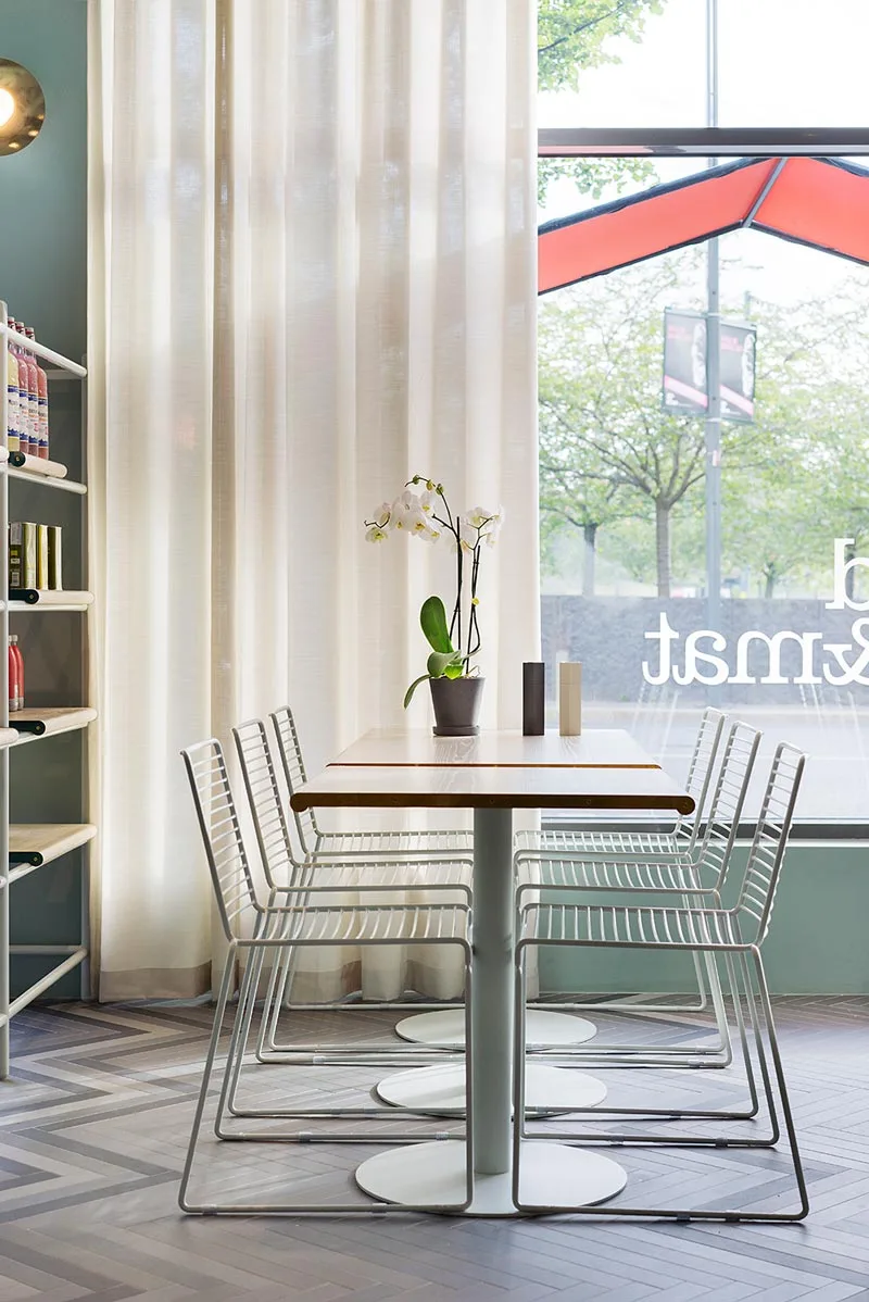 Este nuevo barrio de la capital ha impuesto unos requisitos medioambientales muy exigentes para los nuevos proyectos. Además, el cliente deseaba crear un espacio acogedor tanto para servir un desayuno rápido a primera hora de la mañana como para disfrutar de una comida tranquila al mediodía o de una conversación animada con los amigos después del trabajo al calor de unas cervezas.