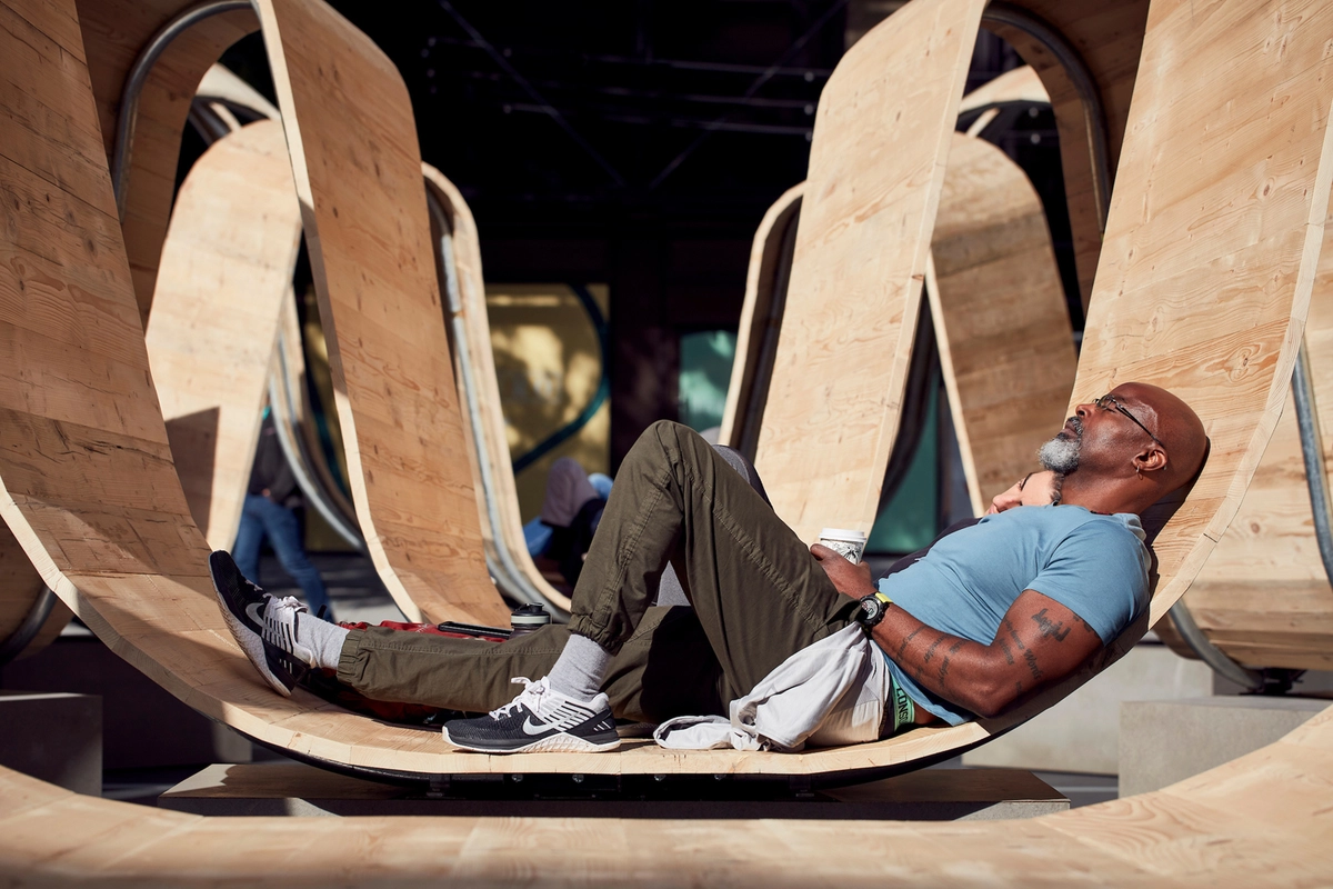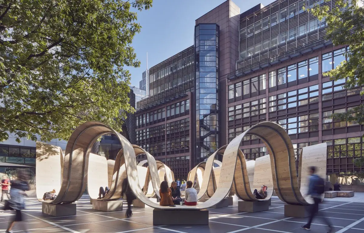 Cocksedge ideó una estructura a gran escala compuesta por tres enormes anillos de madera que se curvan para servir de asiento a todo aquel que quiera descansar, leer, almorzar o simplemente tumbarse un rato antes de volver a la oficina. Las curvas se elevan, crean respaldos y generan zonas de sombra que pueden aprovechar los paseantes. Además, su gran altura también les permite caminar sin problemas por debajo, no suponiendo ninguna barrera al tráfico peatonal.