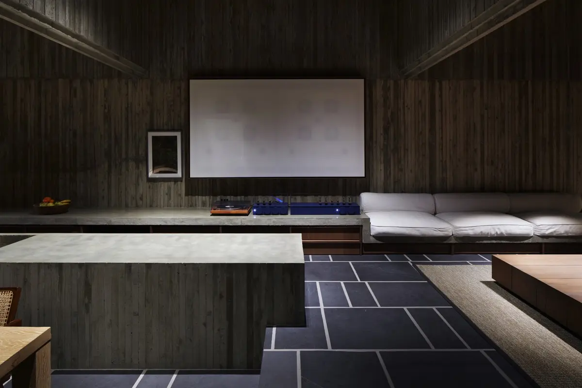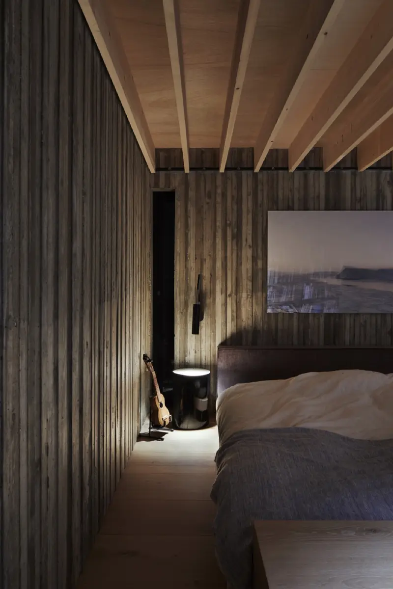Flanqueando la sala de estar, una caja de madera contiene el dormitorio principal, vestidor y un baño con atractivos azulejos negros. El dormitorio cuenta con estanterías empotradas y un techo de madera que proporciona un cálido complemento a las paredes de hormigón.