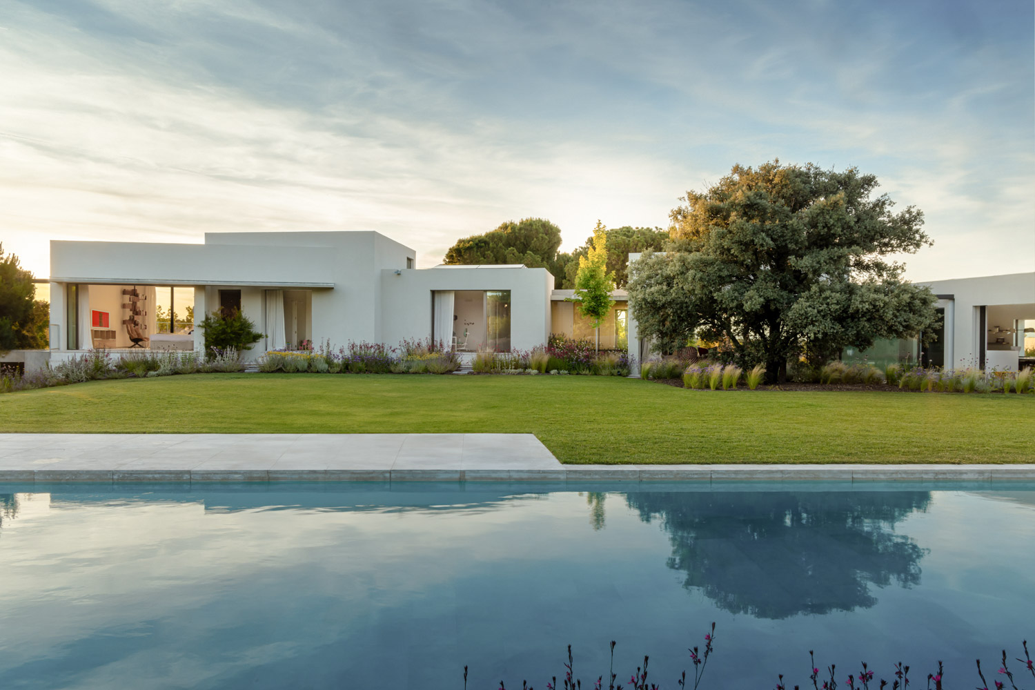 Este concepto de eliminación de las barreras materiales entre exterior e interior se traslada al resto de espacios de la vivienda. El salón se proyecta como un porche abierto al sur, hacia la pradera y la encina, y al norte, donde se genera una terraza en altura sobre las vistas del entorno para su uso durante el verano, siendo la zona más fresca.
