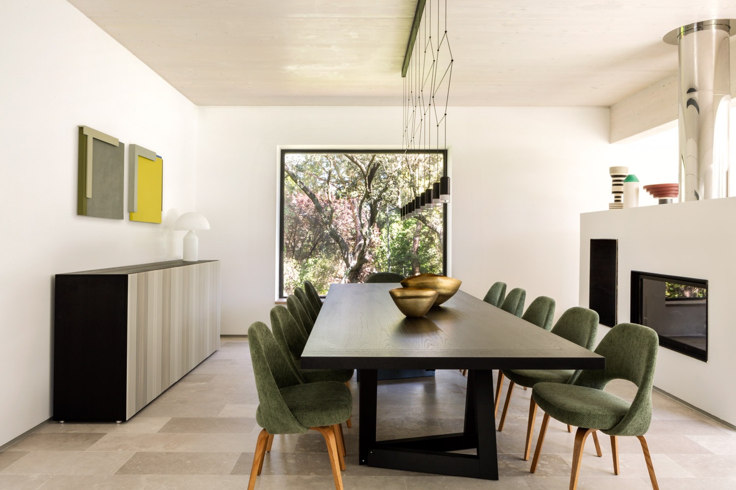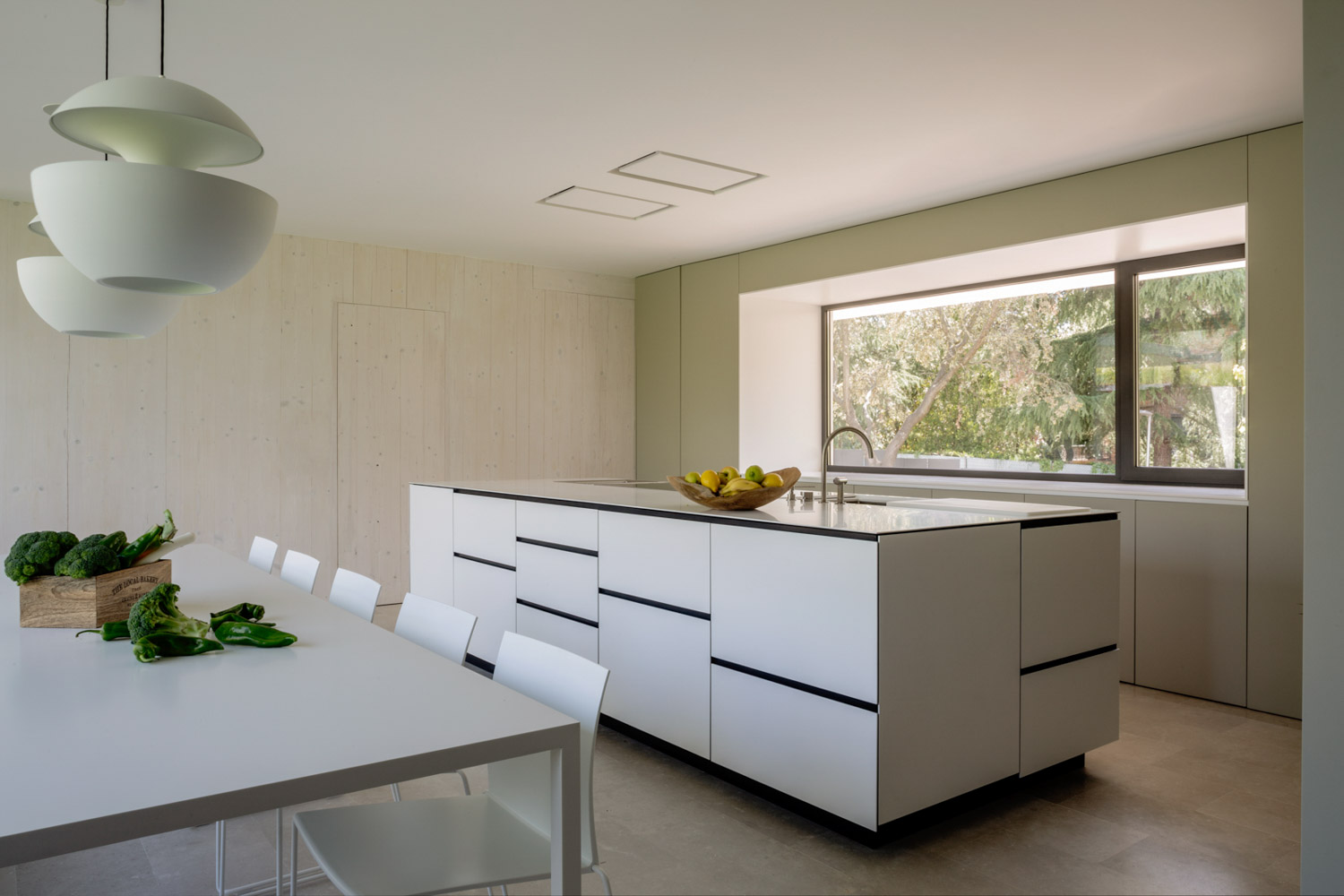 Este cocina de diseño moderno se abre directamente al jardín mediante grandes huecos acristalados, estableciendo una relación constante con el exterior. La luz natural transforma el espacio a lo largo del día, mientras el verde del entorno se incorpora como parte del paisaje interior.