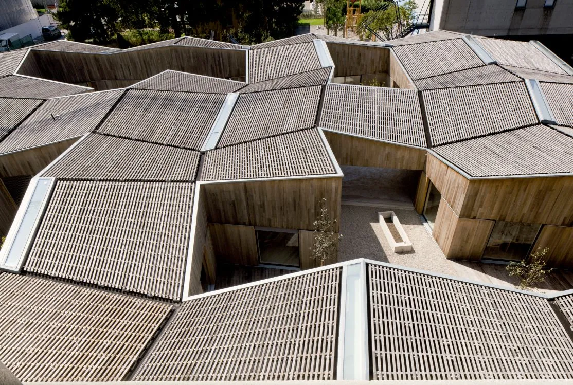 Por otro lado, su estructura en forma de tablero de ajedrez compuesta porpequeñas «casas» y espacios vacíos se sale también de lo habitual. En total, 56 módulos trapezoidales (35 cerrados, 13 vacíos y 8 cubiertos) conforman la guardería, que genera 4 patios interiores de trazado irregular.