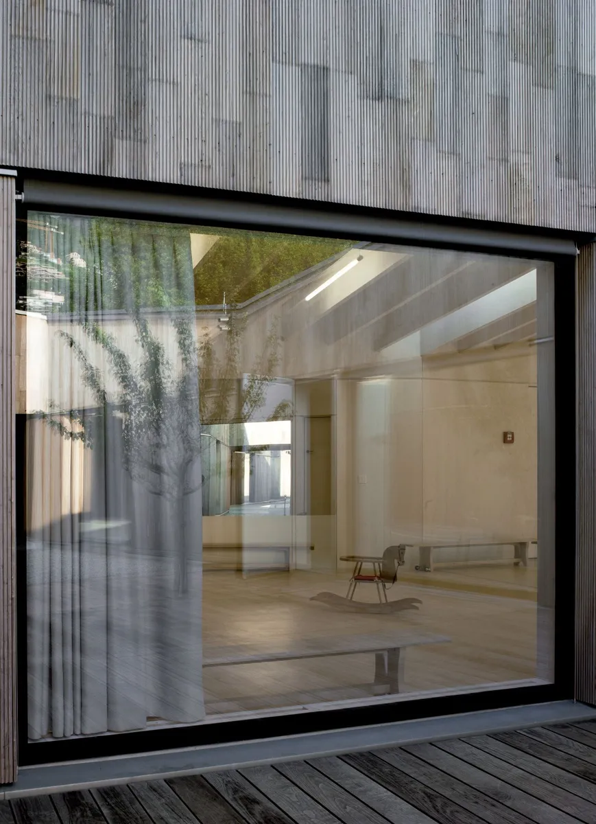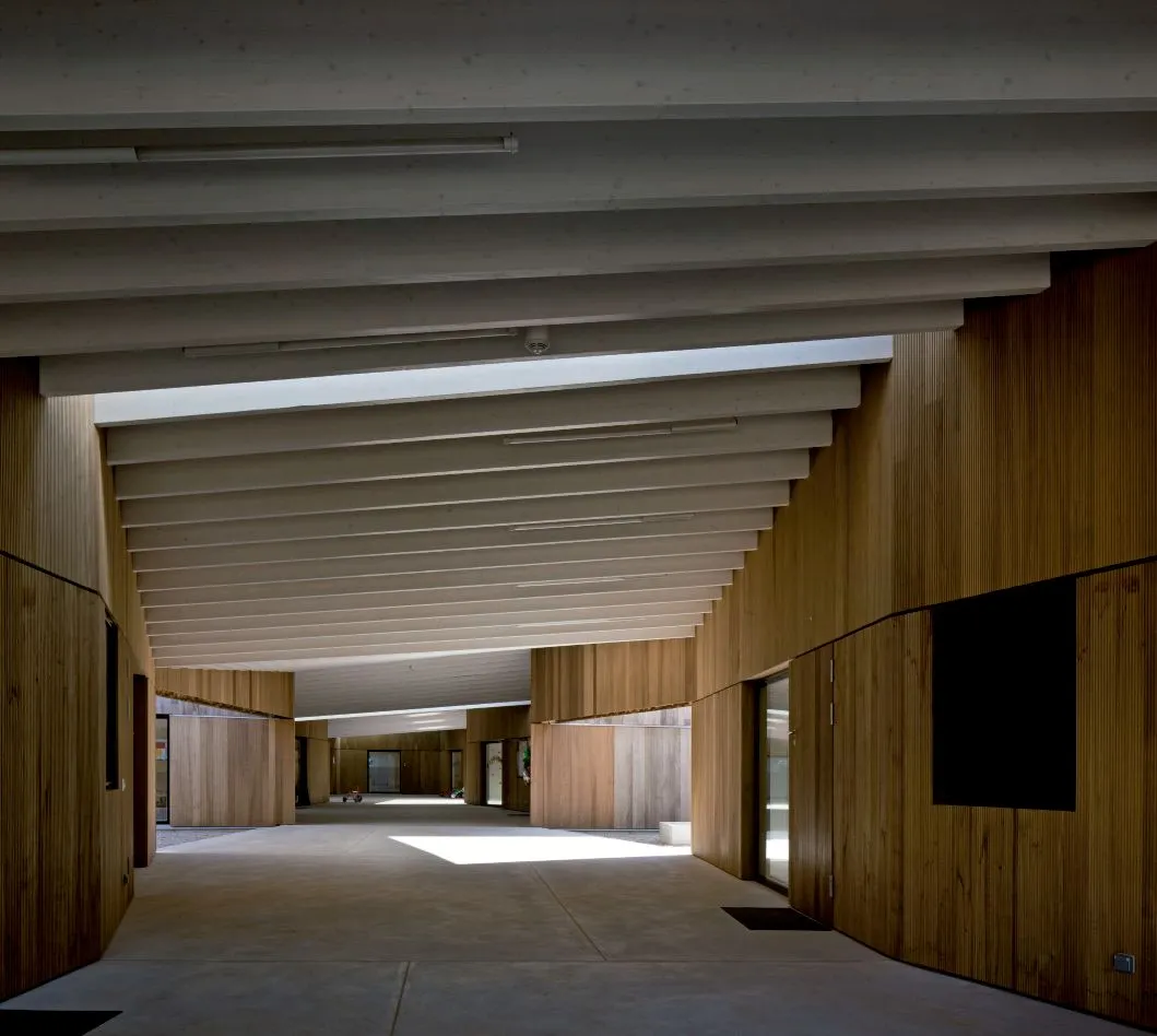 En la cubierta, una fina malla de listones de álamo en color ceniza modela un tejado orgánico con carácter, bien visible desde muchos puntos del barrio. Así mismo, numerosos acristalamientos ponen en contacto directo los patios arbolados y las áreas de estudio.