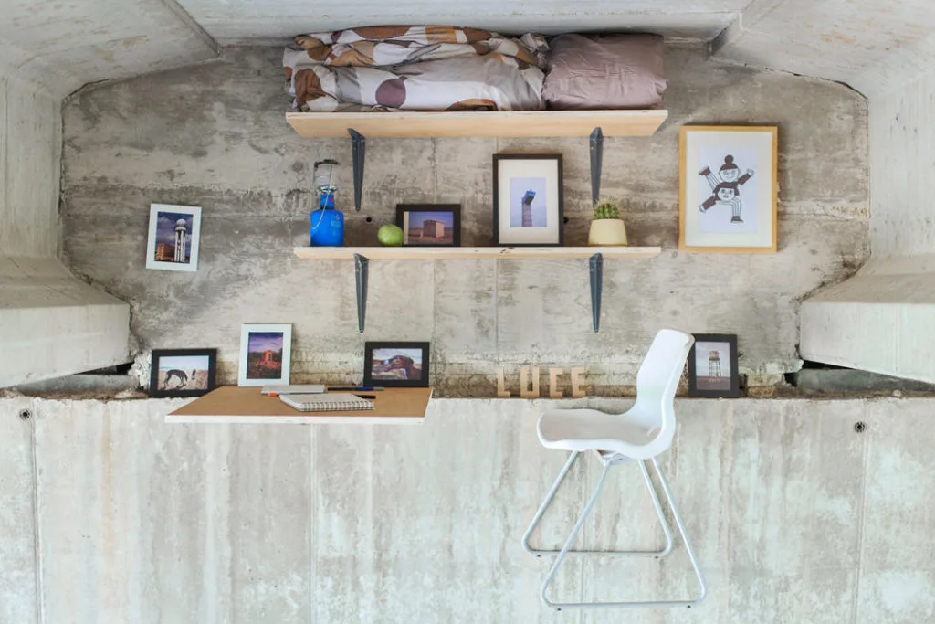 El resultado es un estudio secreto instalado bajo un puente de carretera. Un pequeño rincón privado que rememora la experiencia infantil de esconderse en un armario o bajo la mesa.