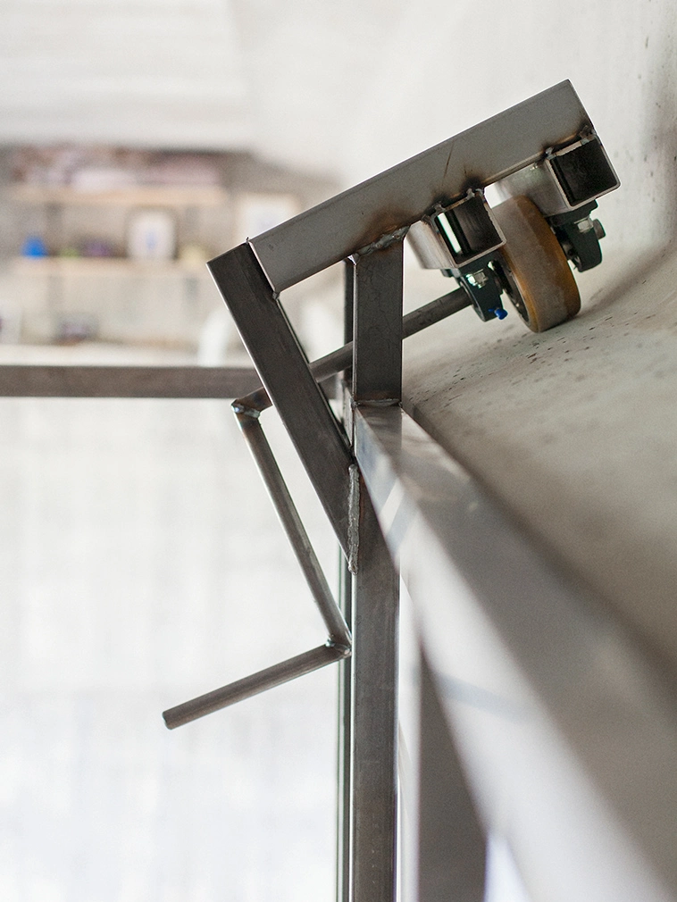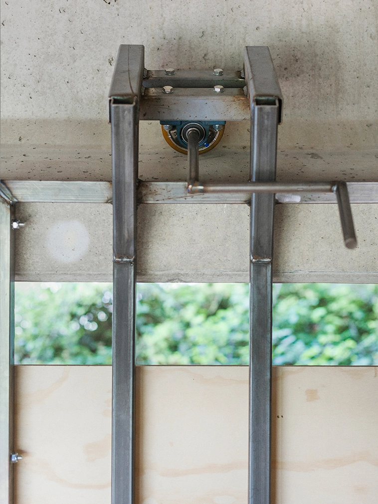Su minicabaña oculta incorpora cuadros, un escritorio, una silla y dos estantes, todo ello cuidadosamente atornillado a la pared de hormigón. Suspendido del puente, el suelo de madera y metal es móvil y completa la construcción. Mediante un sencillo e ingenioso sistema de manivela y rodillos, puede llegar desde el lado opuesto y quedar colgado en el aire, creando un búnker inaccesible desde el exterior una vez conformados los paneles laterales.