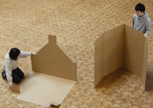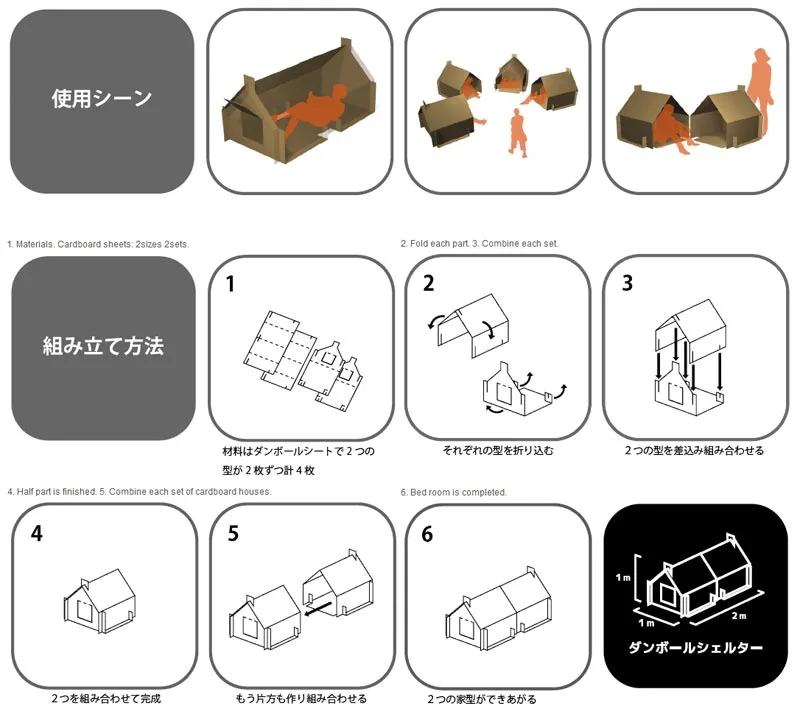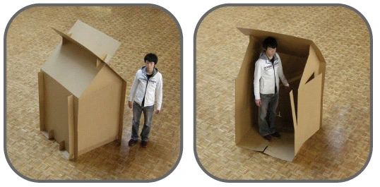 Arquitectura efímera diseñada por el estudio japonés Atelier OPA para uso temporal con mínimos recursos. Han sido patrocinados por la Asociación de Antinguos Alumnos de Arquitectura de Kogakuin University. Son pequeñas casas de cartón que pretenden preservar al máximo la intimidad de los desplazados, damnificados o víctimas de desastres naturales. Los planos están bajo liciencia Creative Commons para que cualquiera los pueda descargar y construir.