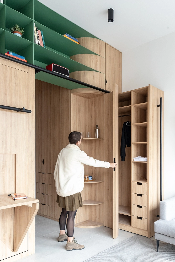 Doméstico integra diferentes funciones bajo una misma envolvente material, dando respuesta a muchos de los escenarios posibles de un habitar contemporáneo: cocina, despensa, estantería, escritorio, armario ropero, desayunador, comedor, dormitorio, sala de reuniones…
