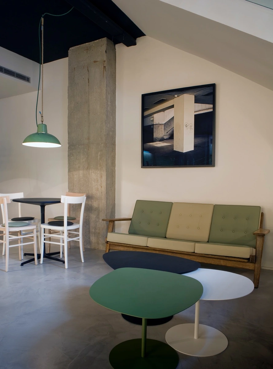 Entre las piezas de edición actual se escogieron, entre otras, las sillas Cherish de Horm en versión madera y en versión lacado en blanco. Y las mesas de centro «3 Galets» de Materie Grisse.