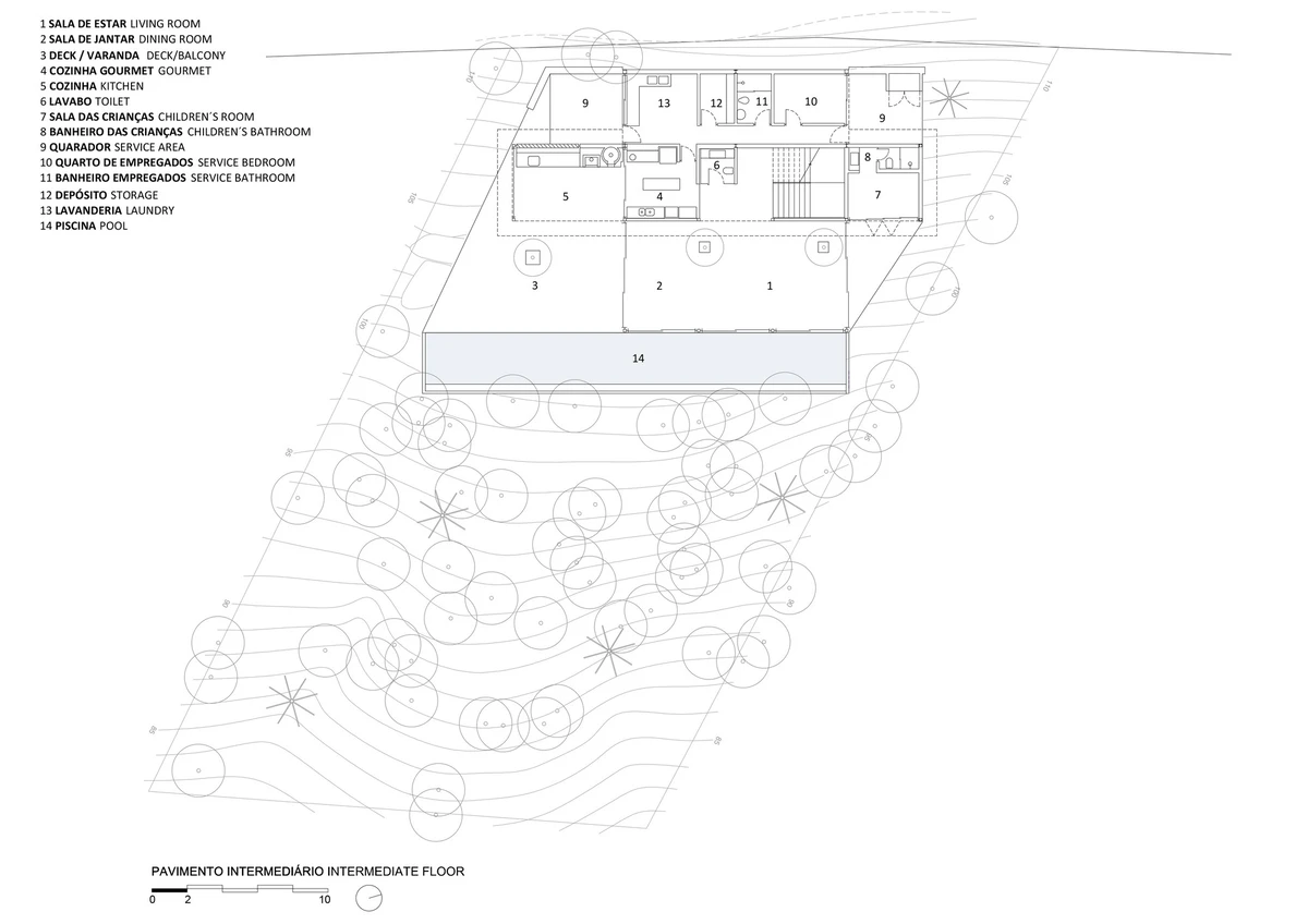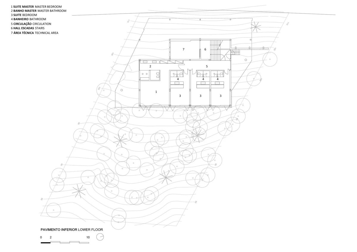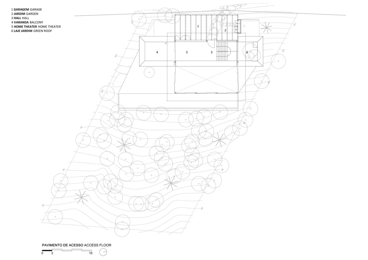 El acceso se realiza por la parte superior siendo esta un altillo con vistas al salón de doble altura. Revestido de cristal, el diseño dota de extensas vistas al contexto de bosque virgen.