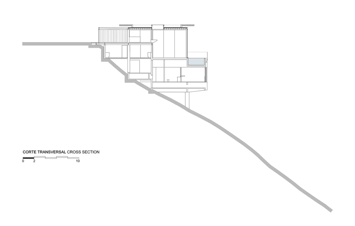 Levantada sobre una escarpada ladera y con 5 puntos de apoyo, su distribución invierte la tipología habitual y coloca los espacios de descanso y privativos en la parte inferior, en donde están ubicadas 5 suites con vistas al mar, logrando de esta manera un plus de privacidad y sombra. En la parte más elevada de la vivienda se encuentran las zonas comunes con unas impresionantes vistas.