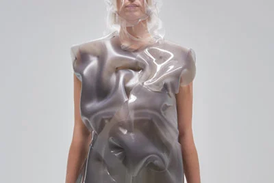 Los vestidos de la diseñadora canadiense muestran también ese fluir continuo cambiando de forma sin cesar. Elaborados con una mezcla de silicona, organza, vidrio y dispositivos electrónicos, aquí la metamorfosis se desencadena a través de los colores. Del mismo modo que un camaleón transforma los tonos de su piel adaptándolos a su entorno más próximo, los colores y las formas de cada prenda varían según el espectro cromático.