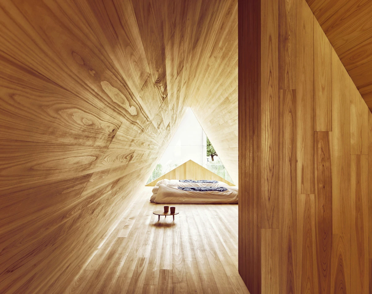 La estética de doble tejado a dos aguas y el entramado en madera de cedro reflejan la esencia de la tradición oriental, aunque con un planteamiento social diferente. Tras su paso en 2016 por la Kenya Hara´s House Vision Exhibition de Tokio, el edificio se reubicó definitivamente en Yoshino, una localidad de la prefectura de Nara, al sur del país. Desde entonces figura en el listado de alojamientos disponibles en la web de Airbnb y los beneficios del alquiler de las habitaciones revierten en diversos proyectos de la comunidad, que es quien se ocupa del mantenimiento de la Cedar House.