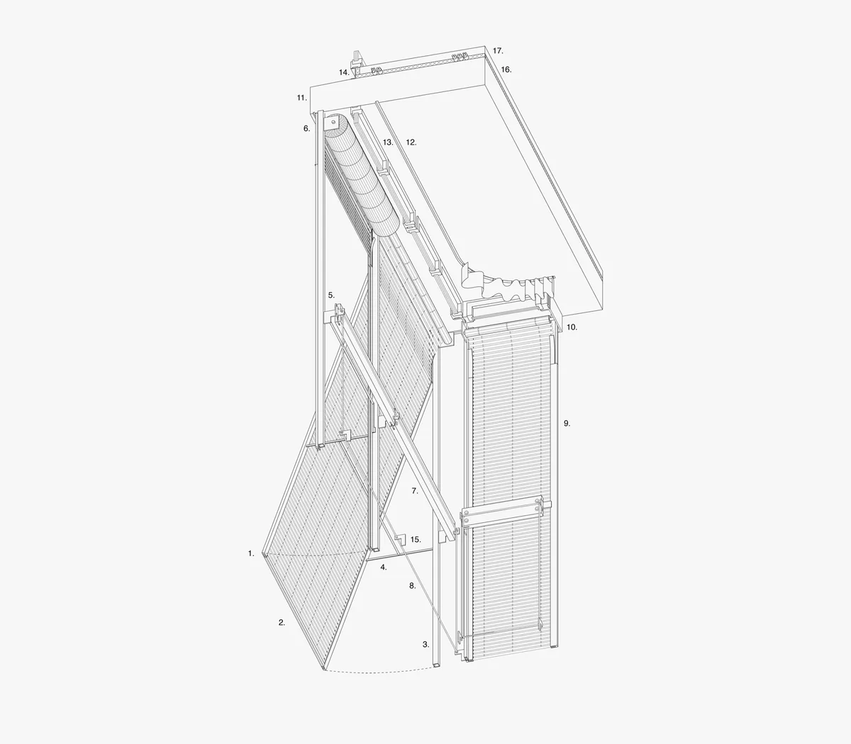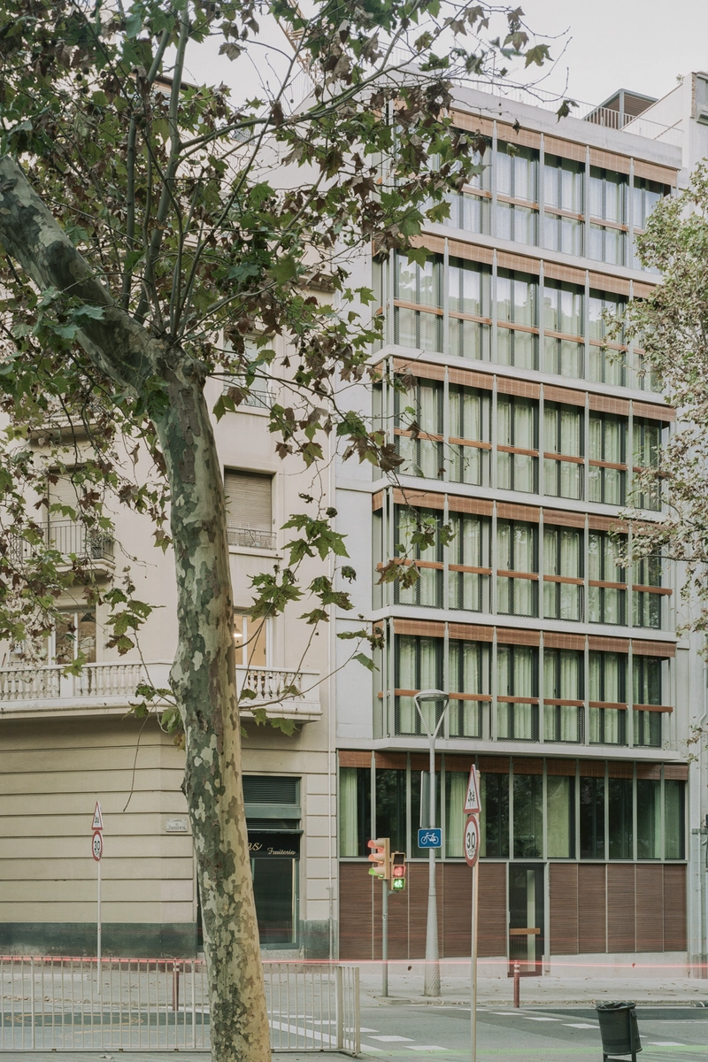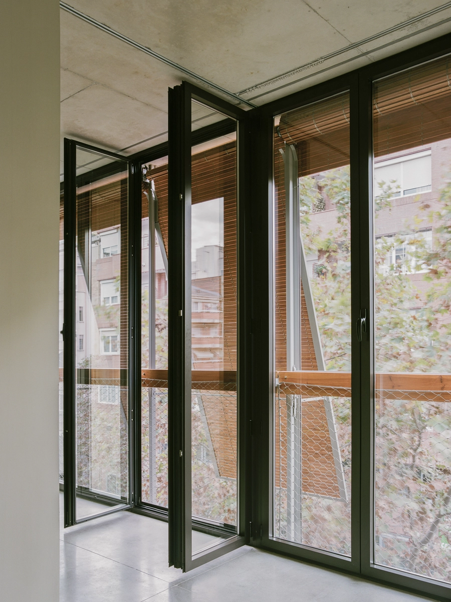 El proyecto explora el potencial de las fachadas de Barcelona del siglo XIX, con galerías acristaladas protegidas por simples persianas enrollables de madera que, al abrirse, forman balcones continuos a lo largo de toda la fachada. El estudio adapta este sistema de sombreado mediterráneo con un diseño personalizado de persianas de pino motorizadas montadas en carpintería de aluminio plegable.