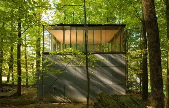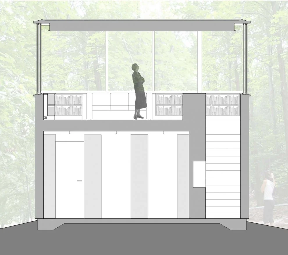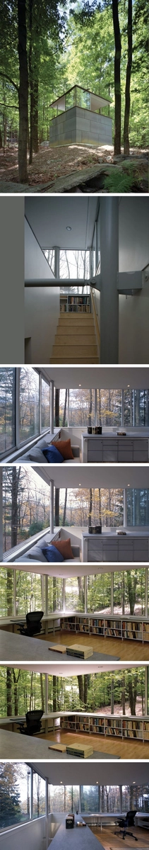 Un cubo limpio y puro encaja perfectamente con el propósito de unidad y forma del edificio, tanto en términos metafóricos como programáticos. La primera planta está sellada y contiene estanterías para libros. La planta superior -completamente abierta- es un espacio para el estudio que descansa sobre los libros ubicados bajo ella. La estructura pretende expresar el carácter dual de la edificación, con la cubierta flotante que sobresale sobre la planta superior para enfatizar la distinción entre lo sólido y el vacío. Los ventanales abren en las 4 direcciones, recogiéndose en las esquinas opuestas para crear la sensación de apertura al bosque. El cambio de estación proporciona que los «muros» sean verdes en verano, naranjas en otoño y blancos en invierno.