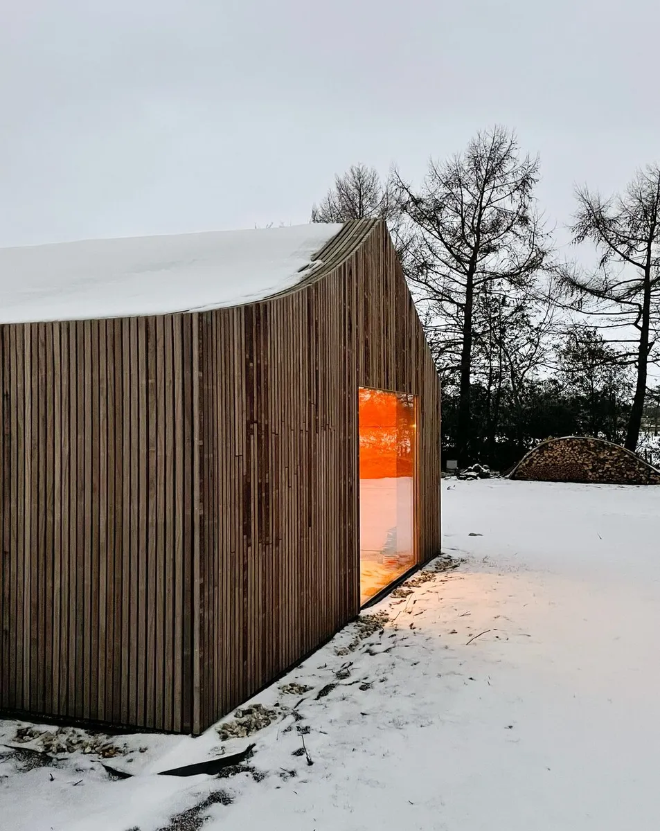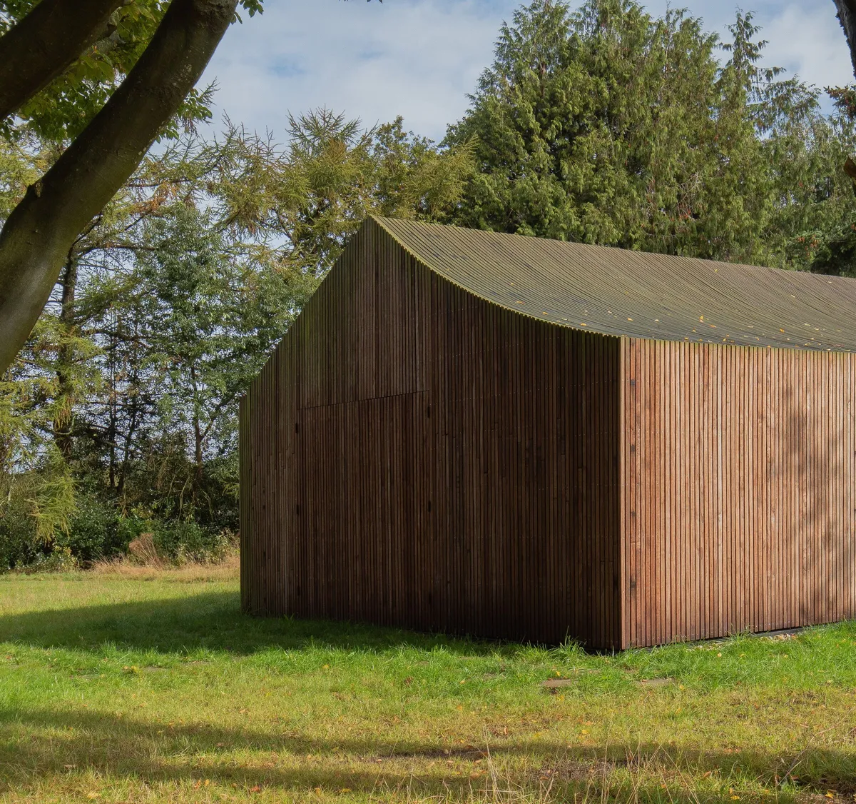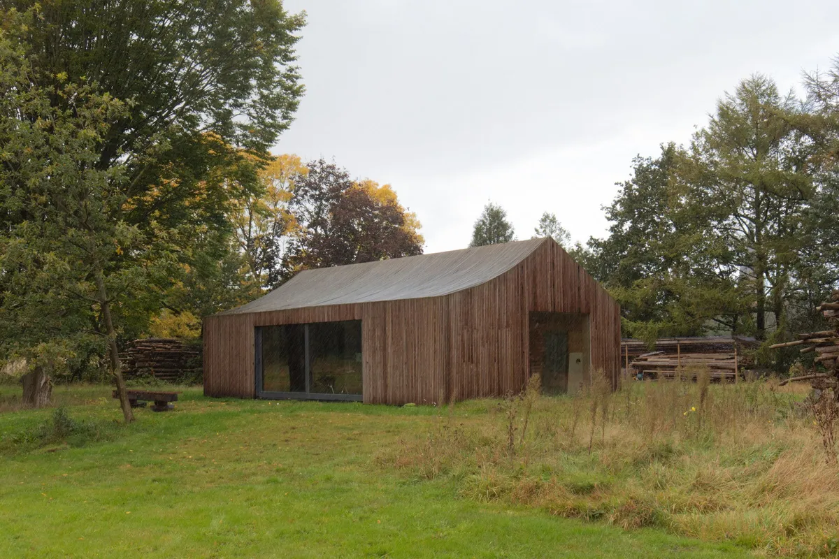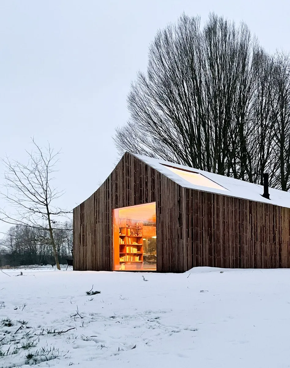 La vieja cabaña inspiró tanto la forma como los materiales empleados en este rejuvenecimiento de un espacio en mitad del campo. Sin embargo, se dio una lectura contemporánea al concepto clásico de cobertizo en el jardín a través de un toque «escultórico» tanto en el techo como en su envoltura.