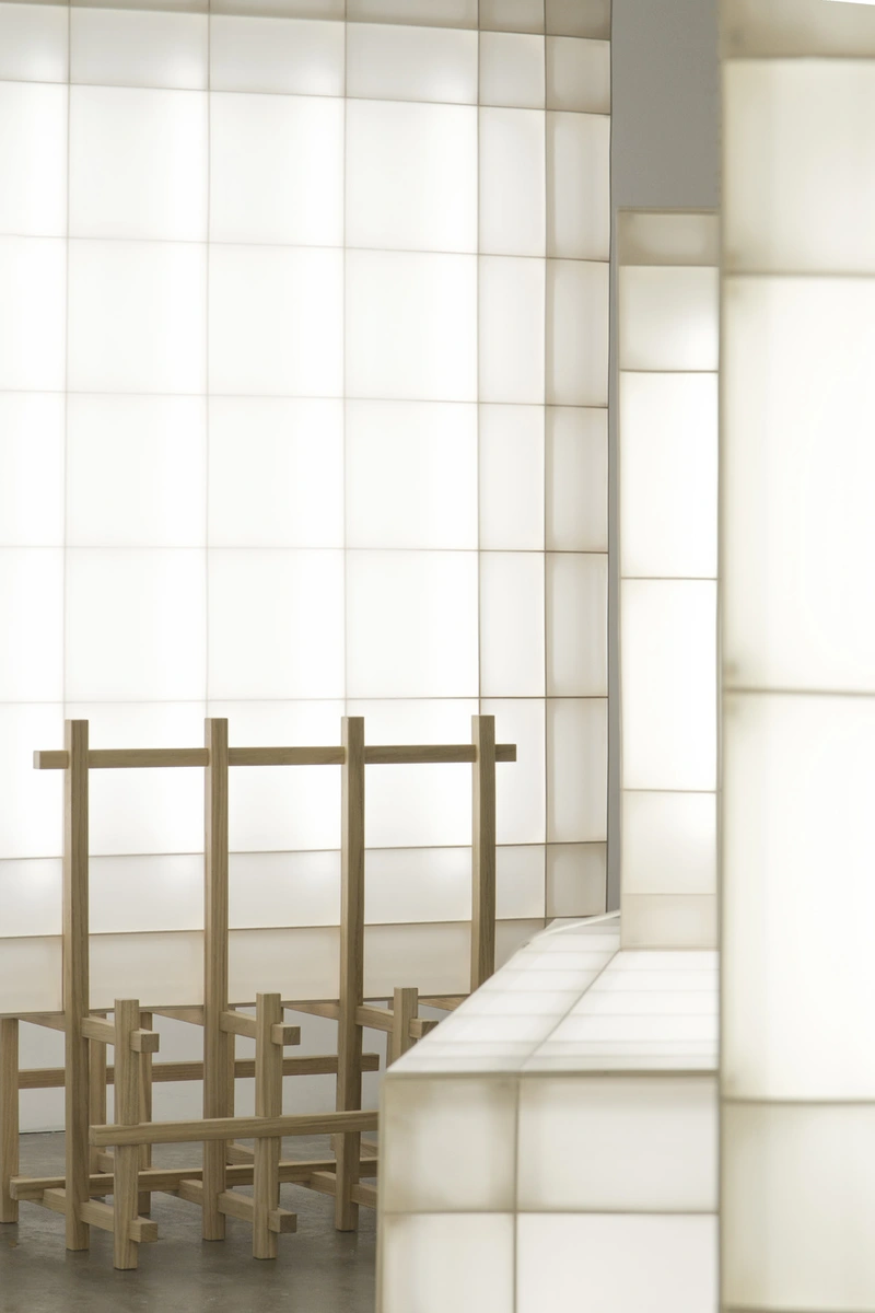 Algunos de estos objetos luminosos descansan sobre sí mismos, mientras que otros necesitan la ayuda de soportes metálicos mínimos. Las piezas más robustas exigen una base elaborada con listones de madera, que se inspira a su vez en las livianas estanterías de roble Frameworks, diseñadas por esta pareja creativa holandesa.