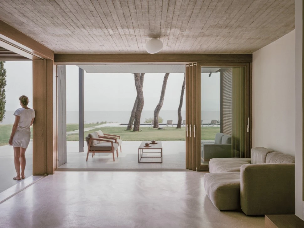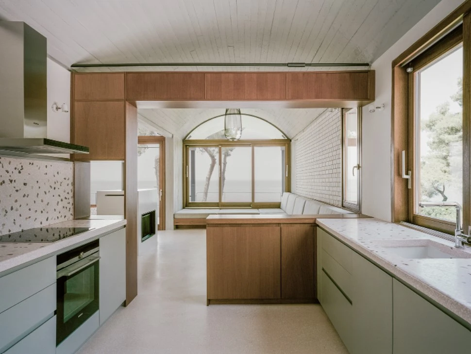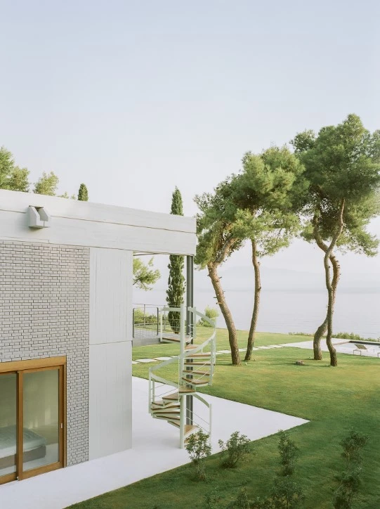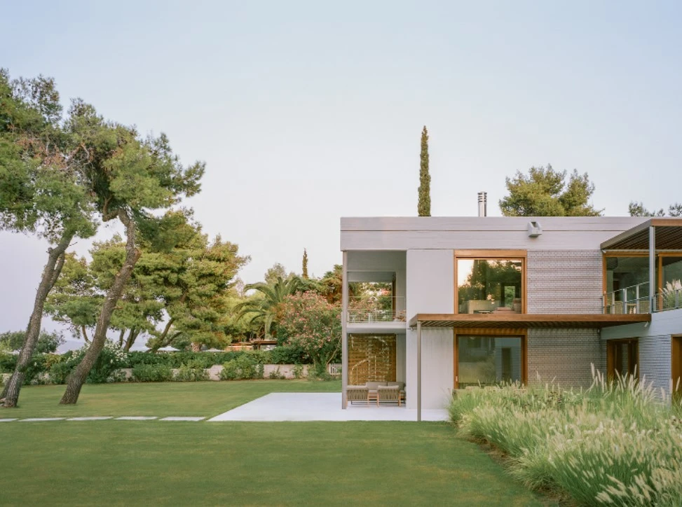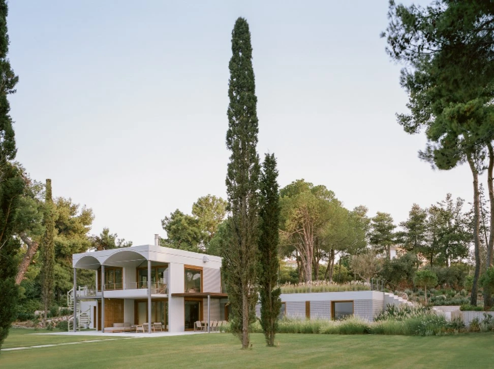 El estudio Neiheiser Argyros partía de una base ya existente diseñada por el arquitecto griego Nikos Hadjimichalis en los años 70, un espacio que llevaba deshabitado más de diez años. La firma ateniense decidió conservar algunas partes del edificio, pero introduciendo nuevas aperturas y ampliaciones. Mientras que la construcción original se orientaba toda hacia el mar, la nueva estructura se extiende en varias direcciones. Así se saca mucho más partido del entorno natural: pinar, arboleda, pradera y mar.