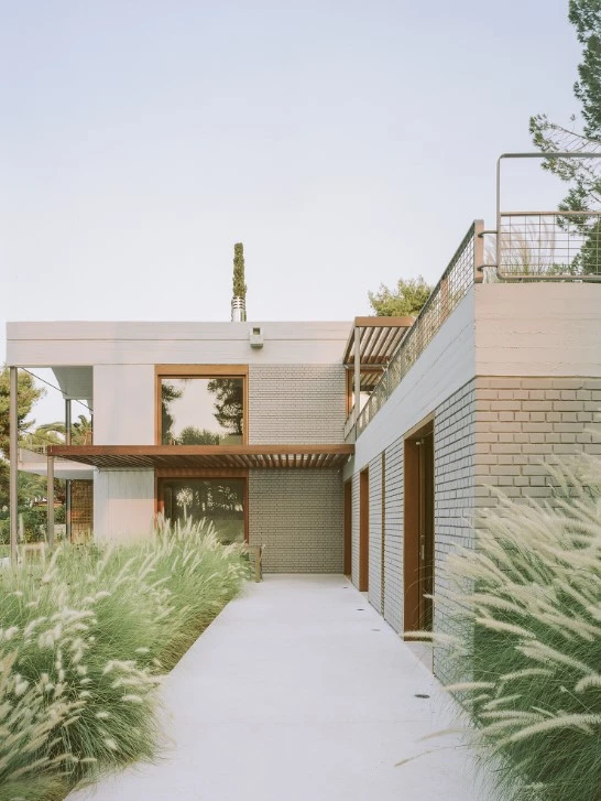 St. Minas House se oculta desde el camino de acceso gracias al pinar y los olivares. Además, la inclinación del terreno esconde una fila de dormitorios heredada del diseño de los 70. Sin embargo, perpendicular a ella, se proyecta el volumen principal de dos plantas que se abre también en los costados para formar múltiples terrazas conectadas con la naturaleza.