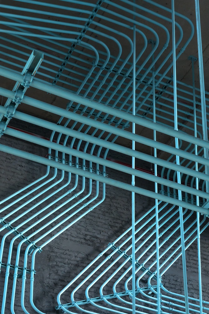 La línea argumental en cuanto a decoración parte del propio logotipo de la empresa Hubba. Sus múltiples líneas interconectadas inspiraron a los diseñadores a la hora de crear un nexo de unión entre las diferentes salas. Así pues, aprovecharon los conductos que distribuyen el cableado para unificar el primer y el segundo piso. Al pintarlos de un intenso color turquesa, constituyen una potente marca visual frente a los tonos grises y ocres dominantes, recordando las conexiones de un circuito impreso.