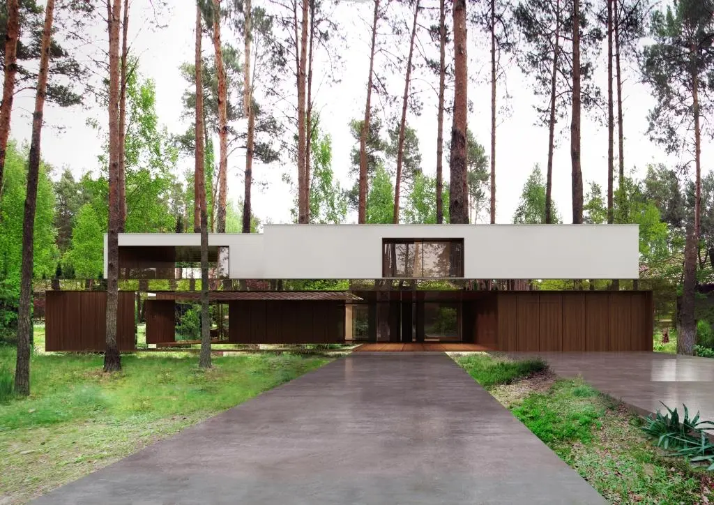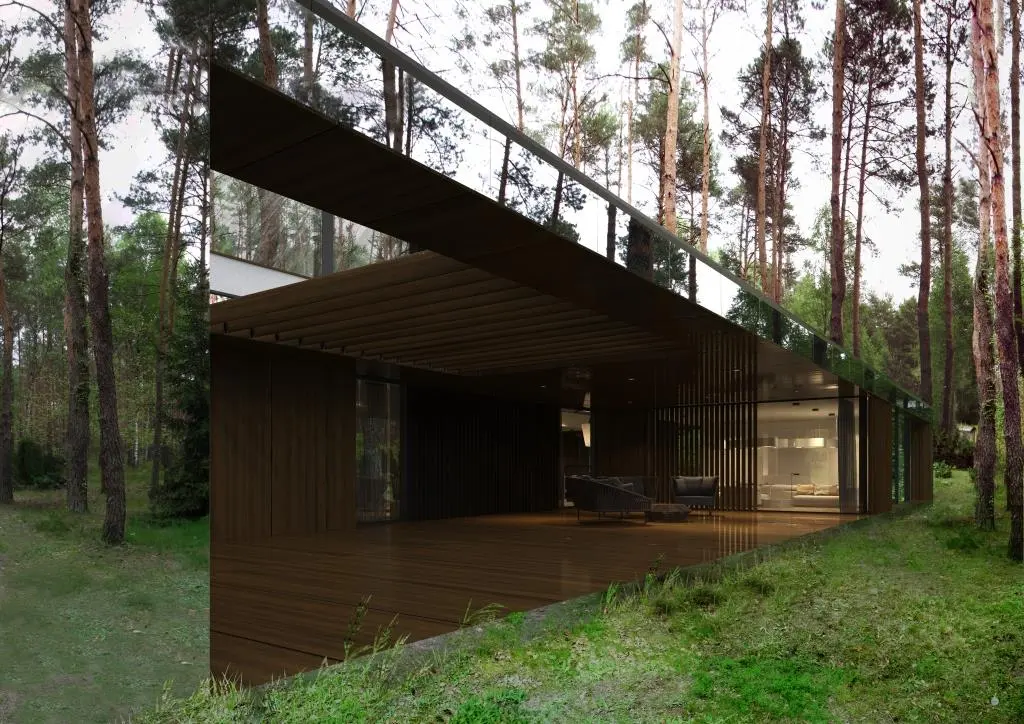 Revestido en la planta inferior por paneles reflectantes, convierte a las superficies espejadas de esta en una extensión de la vegetación del bosque, consiguiendo un efecto de flotación en la planta superior. Además, el nivel inferior incluye también una terraza recubierta con una cortina de madera del mismo color marrón oscuro que la tierra de alrededor.
