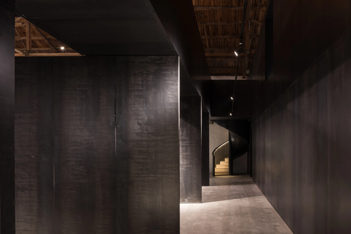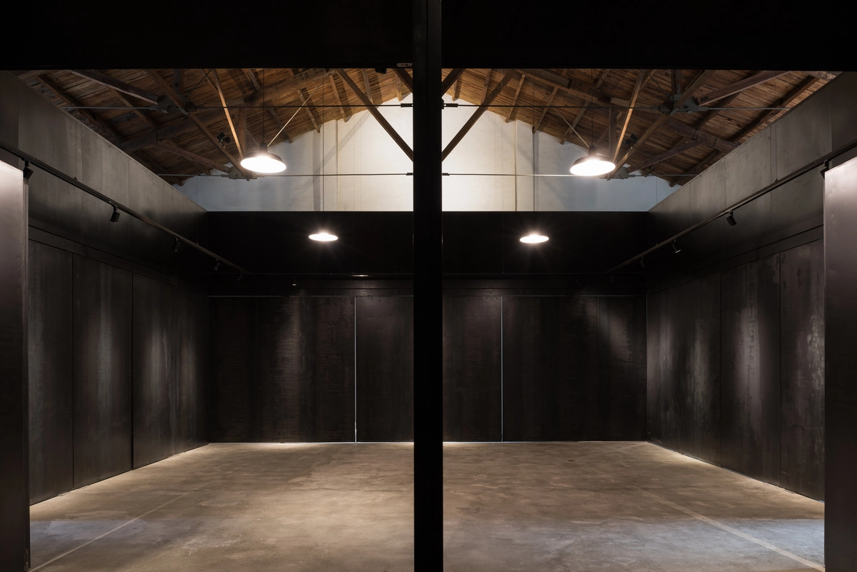 Se crea así un pasillo que se extiende a lo largo de la parte central del edificio, reservando la parte trasera para la sala de exposiciones. Allí, unas paredes de acero pivotantes hacen la función tanto de muros de separación como de paneles para instalar las obras de arte. De este modo, la versatilidad del área es total. Solo con abrir o cerrar paneles se puede pasar de un espacio fluido a una estancia privada para conferencias o talleres.