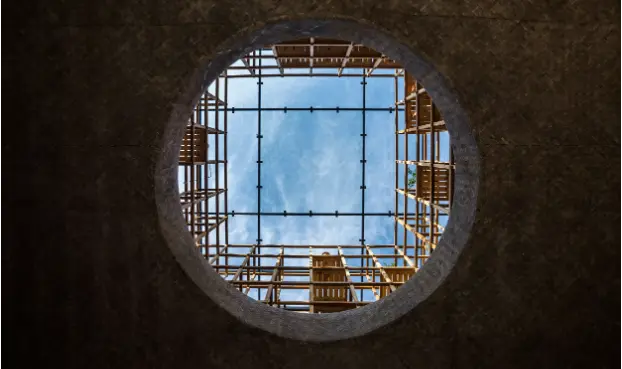 La parte más externa del estudio está realizada con ladrillo macizo, pero lo verdaderamente destacable es el entramado presente en cada fachada del cubo, donde la variopinta disposición de los ladrillos crea huecos que favorecen la ventilación y permite que la luz natural inunde el interior.