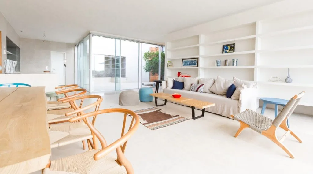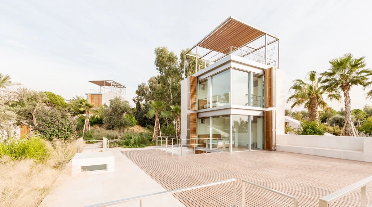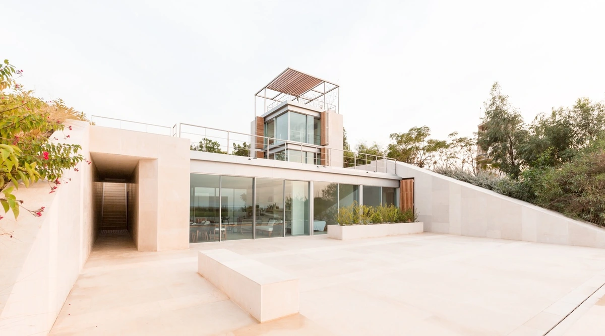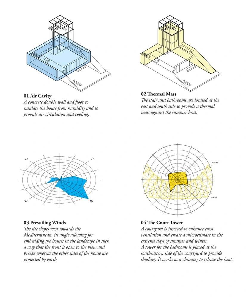 En esta ocasión, la ubicación y la climatología condicionaron buena parte de las decisiones. Las parcelas estaban situadas en una suave pendiente muy cercana a la playa, por lo que se aprovechó esta inclinación para integrar las casas en el paisaje. Así, la fachada se orientó hacia la panorámica del Mediterráneo para disfrutar de las vistas y la brisa del mar, mientras que los costados y la parte trasera quedaron protegidos por la tierra en un sistema de doble muro.