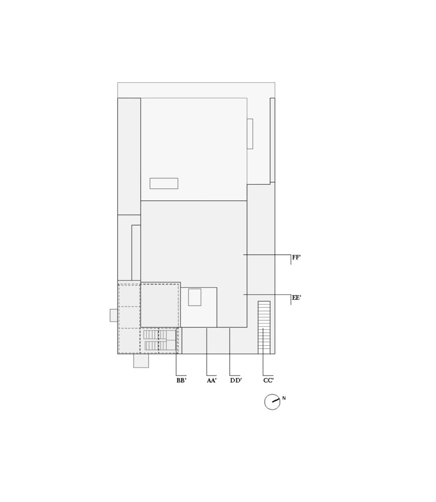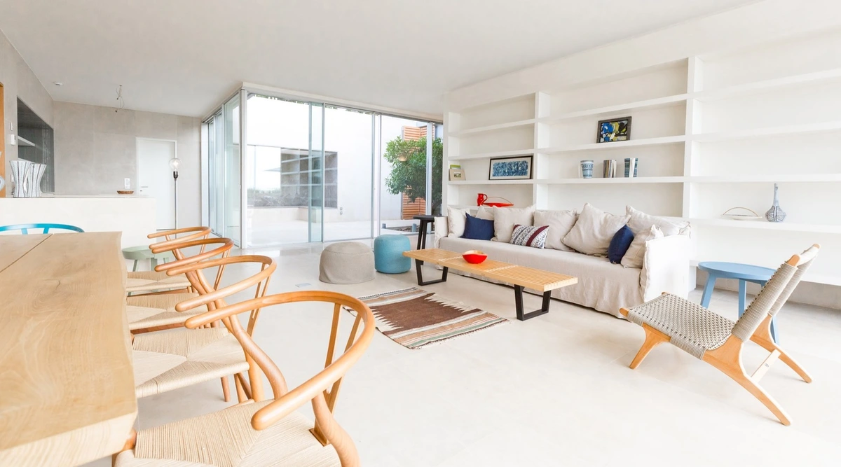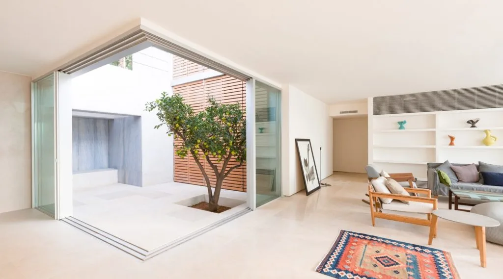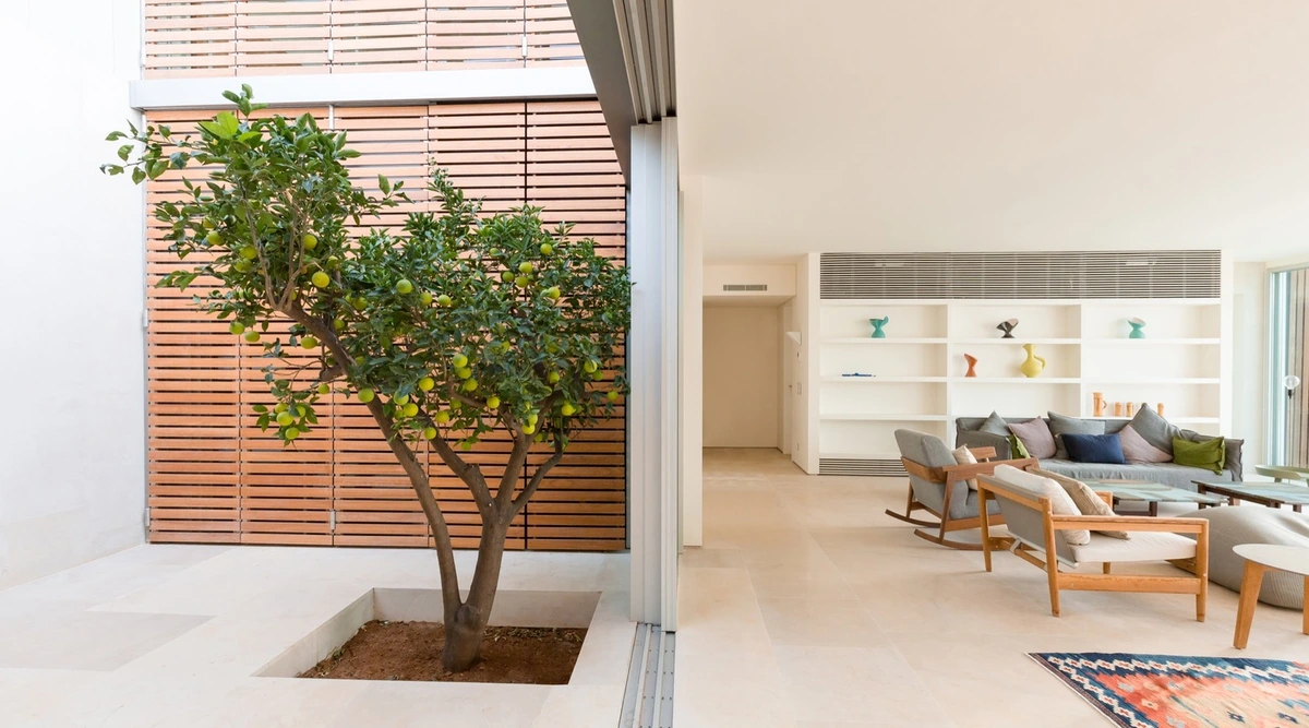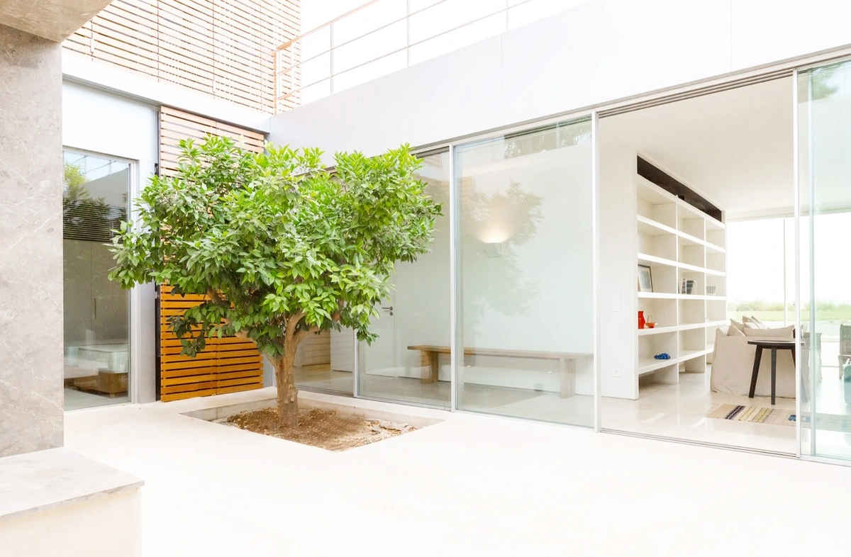Esta pared duplicada logra un perfecto aislamiento, al tiempo que genera un pasillo perimetral que atrae el aire fresco al interior. También funciona como acceso a buena parte de las estancias de la planta baja, dejándola totalmente diáfana. La presencia de un patio en la zona posterior aumenta la ventilación cruzada, siendo especialmente útil en los sofocantes días de verano.
