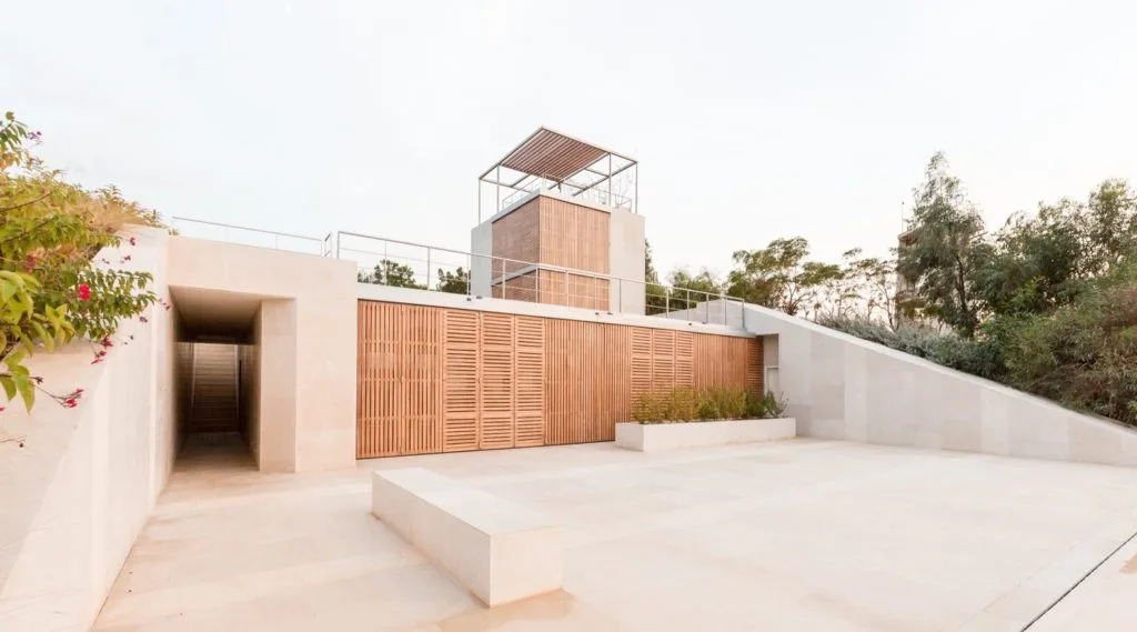En cuanto al paisajismo, se buscó crear una transición suave entre la playa y la colina con ayuda de especies que no necesitan riegos frecuentes. Parte del terreno se cubrió con diversos caminos de acceso, plantando en las zonas libres olivos, palmeras, arbustos y otras plantas de la región.